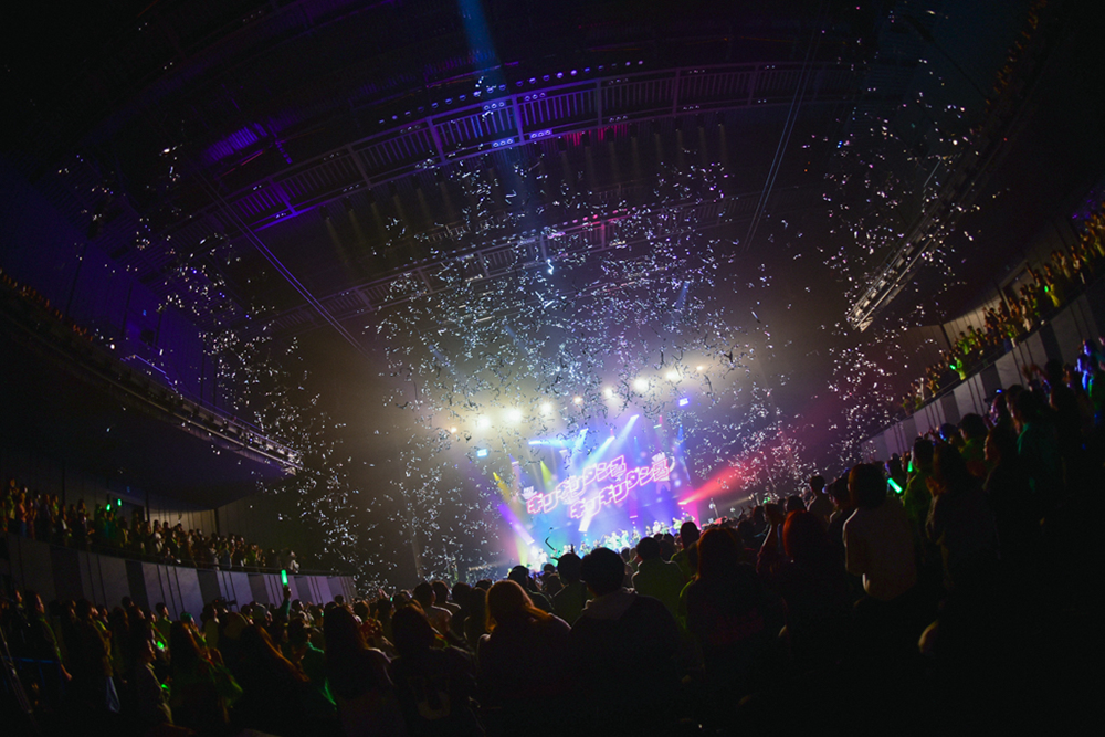 そうして、これから年末年始の忘年会や新年会をきっかけに、幸せな頃を思い出いだしてという意味も込めて、オシャレなシティポップにのせて心地よく響くファルセットを使って“戻れ”を連呼していく「いろは」を歌唱。歌い終えたこっちのけんとは「今年ですべてが変わってしまいました。プライベートでは結婚もしまして、本当に人生が変わりました」と真面目な表情で会場に話しかけた。だが、結婚した後は曲を作りたくてもできない日々が続き活動が止まってしまた時期があったことを伝え、そんななかで「いまの会社に人生最後のチャンスを頂いたので、ノリノリの曲で自分の人生さらけ出そうと思って曲を作り出した」と明かした。改めて自分を支えてくれたスタッフに感謝を伝えたあと、再びダンサーたちを呼び込み、最後は「はいよろこんで」を全力でパフォーマンス。ダンサーと一緒に客席も“ギリギリダンス”を踊り、場内が大きな一体感に包まれた頃、それを祝福するようにきらびやかなテープが場内に舞い降りて本編は終了した。