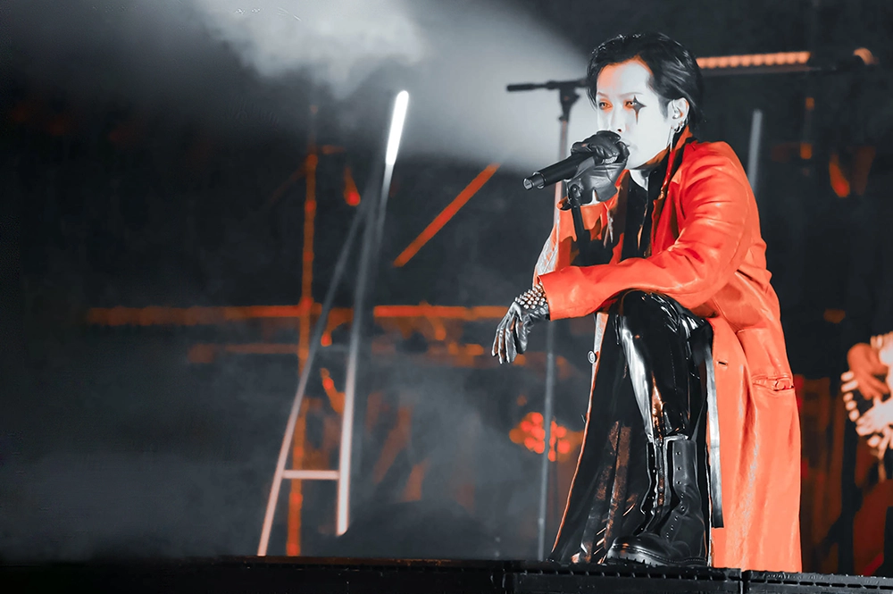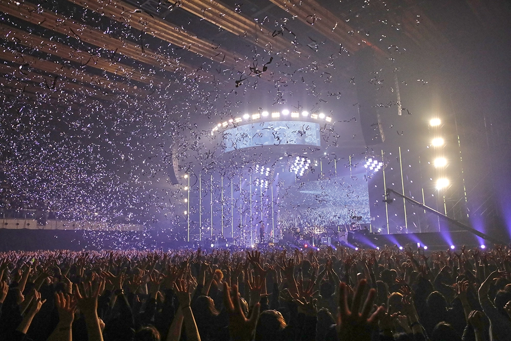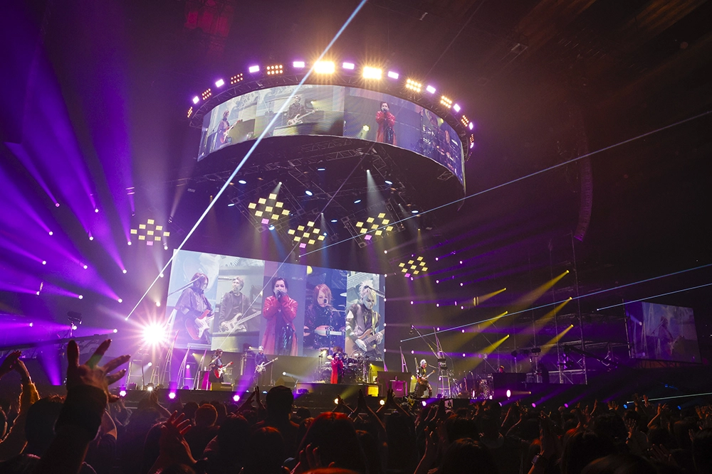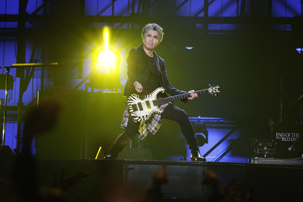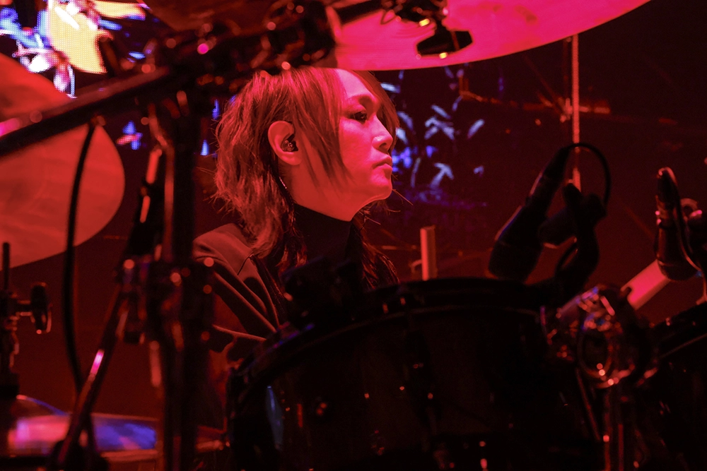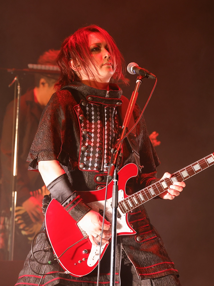 今回のステージは、映像や照明とメンバーのパフォーマンスとの融合が、楽曲の世界観を広げたところも見どころの一つだった。「脳内モルヒネ」ではAIを駆使したストーリー仕立ての映像が楽曲の不穏さと切なさを増幅させ、「ドラキュラ」では不気味に佇む暗黒城に雷光が落ちていた。「パウダースノウ」では光の粒が雪のようにしんしんと降り、「THE LAST CRY IN HADES(NOT GUILTY)」でのステンドグラスの映像は厳かな演出を、「鬼と桜」では腕を振り下ろすキリトの動きに合わせて光の粒が飛び散るさまが印象的だった。モノクロの映像が混沌とした世界を映した「ゲルニカ」では、メンバーの前を炎が横断した。