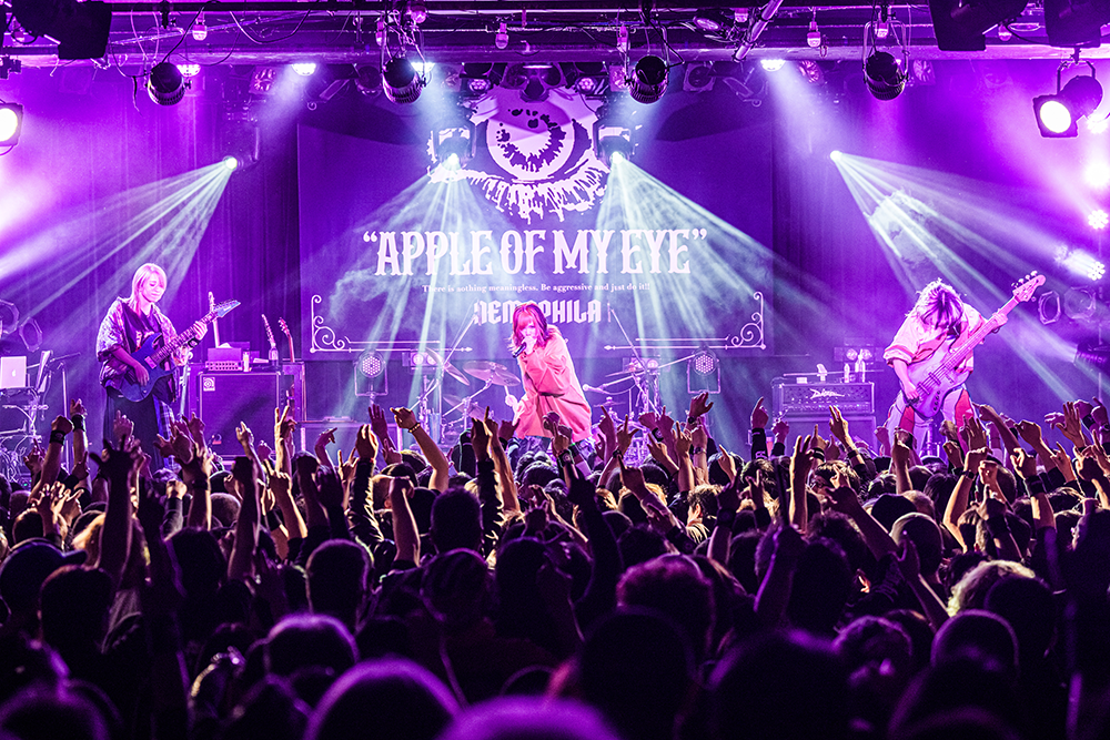 5曲を披露し、mayuは満員の観客を目の前に「LIQUIDROOMは出てみたかったステージで、まさかソールドアウトするなんて!」と喜びをあらわにする。「うちらも元気もらってるんで、皆さんのことはわたしたちが爆音で元気にさせるので。今日は思う存分暴れてってください!」と、その後もアルバム曲と過去曲を織り交ぜて立て続けに演奏した。5人編成時の楽曲も4人編成用にアレンジを組み直しており、さらにはこれまで演奏してきたという経験もあるため、成熟さと新鮮さを併せ持っている。思えば『Apple of my eye』というアルバムも、これまでのNEMOPHILAが培ってきた“ポジティブなバキバキサウンド”という武器でもって、4人のキャラクターや感情を表現した体当たりの作品だ。すべてのNEMOPHILAの歴史が、4人をあのアルバムとこのツアーへと突き動かしているのだろう。
