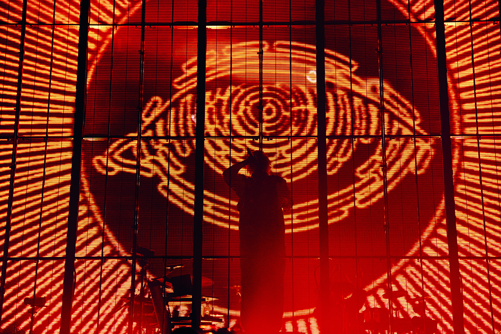 「DERO」のイントロに入るや否や会場は緑のライトで染まり、EMAは感情的に観客へと呼びかけた。アグレッシブでありながらもセンチメンタルなムードを醸す仄暗いトラックに乗せて、ふたりの抑えきれないほどの歓喜の高揚が伝わってくる。その後も赤い照明のなか火の玉が上がった「火焔」、白い照明のなかEMAが拡声器でラップを歌う「Heaven and Hell」、黄色い照明のなか客席から大きなシンガロングも起こった「TOUBOU」と、エッジーでダークでありながらもポップネスも持ち合わせる楽曲を、カラフルかつダイナミックに届けた。