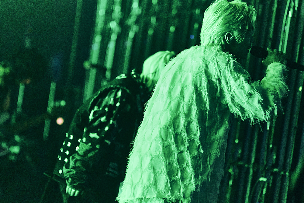 この後のセクションではDUSTCELLが持つ振れ幅をドラマチックに見せてゆく。EMAがソロ名義で発表した「PLAIN」では一言一言に命を吹き込むようなボーカルがひしひしと胸に響き、感傷的かつ情熱的なロックナンバー「Void」で空気を変えると、Misumiのソロ曲をセルフカバーした「狂う獣」、1stフルアルバム『SUMMIT』時に制作していたものの4年以上寝かせていたという最新シングル曲「SCAPEGOAT」、とたたみかけ、「Nighthawk」では同曲のフィーチャリングアーティスト・たなかがサプライズゲストとして登場。毒牙をむき出しにするような、たなかのボーカルと静かに流れる涙のようなEMAのボーカルがエモーショナルに融合し、会場を大いに沸かした。
