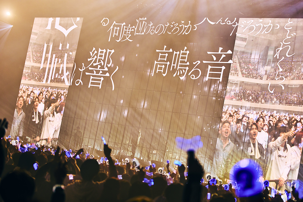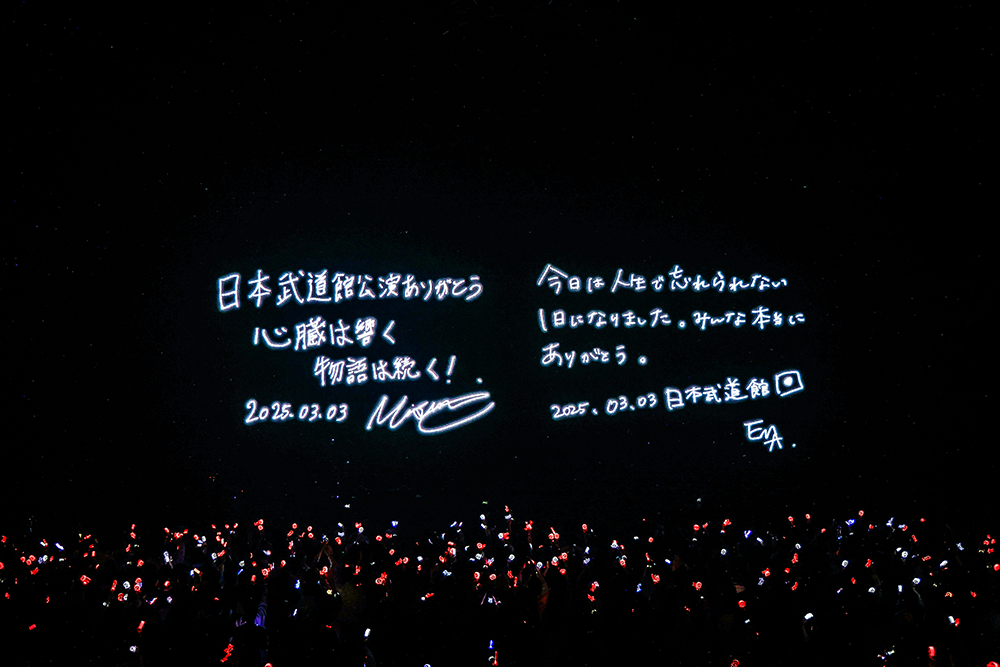 「雨の植物園」のアウトロでメンバー紹介をして華やかに彩ると、観客とコミュニケーションを取るEMAはペンライトの光で埋まる客席を眺めながら「(ステージの前面を覆う)LEDモニター越しに見える景色が本当にきれい」と零し、Misumiも「本当にそうだね。海みたい」と重ねてふたりで感謝を告げる。そしてあらためて多くの観客と日本武道館で集まれたことを喜んだ。