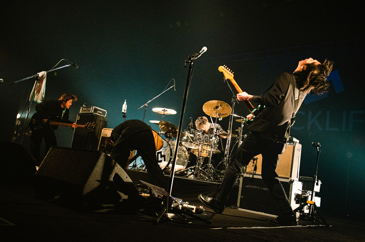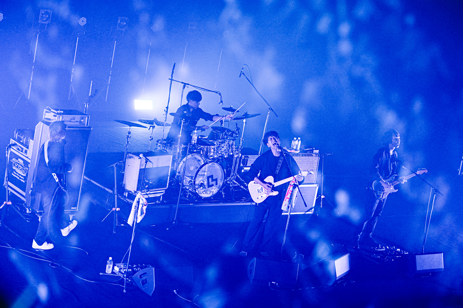 テンポのいいMCで会場を沸かすと、「Naru」「Believe」とバンドの信念が凝縮された楽曲をドラマチックにつないでいく。パワフルでありながらもきめ細やかで、ポジティブでありながらも感傷的な音色だからこそ、ラックライフの音楽はPONの言うように“心に刺さって抜けない歌”になるのだろう。迫力あるドラムソロからメンバー紹介をして「Hand」に入ると、雄大な音色に乗せて「声と手拍子をください」と高らかに叫ぶ。彼らが観客に行う呼びかけは、ライブを盛り上げるためではなく、心を通わせるためのコミュニケーションだ。その後も2014年にリリースされたフルアルバム収録曲「雨空」、フレッシュかつエモーショナルな「風が吹く街」と、フロアとの結束をさらに強めていった。