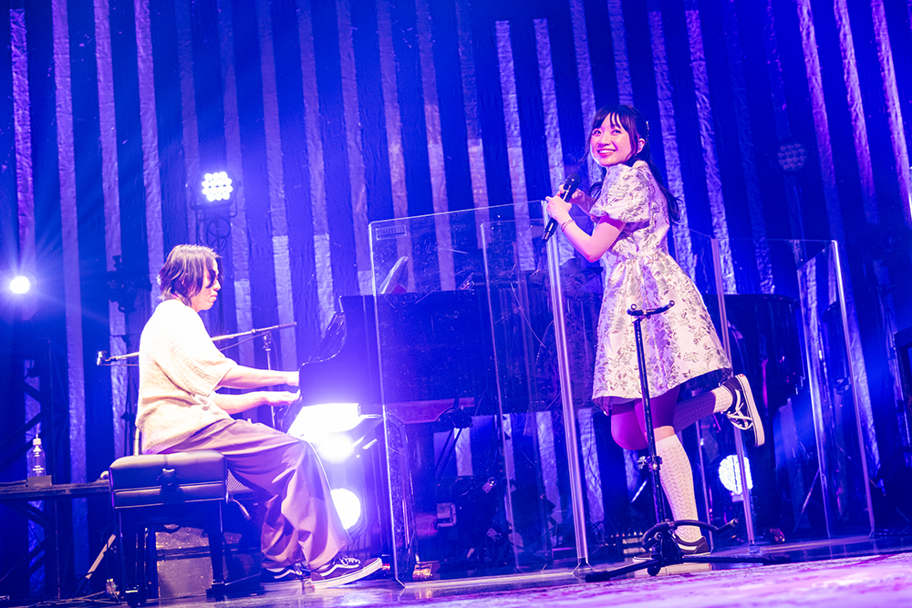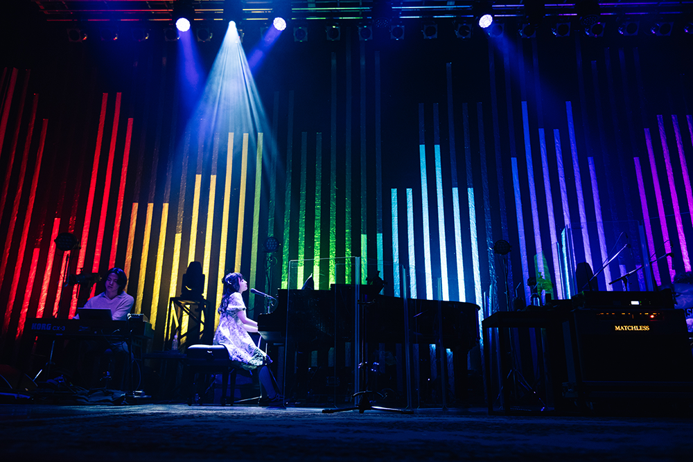 その後のMCで、「今日、30歳になりました!」と報告すると、場内は「ハッピー・バースデー・トゥ・ユー」の大合唱となった。「皆さんにお祝いしてもらってすごく嬉しいです。30歳もよろしくお願いします」と感謝の気持ちを伝えると、バンドメンバーと「ハタチの頃、何してた?」という思い出を語り合った。そして、グランドピアノに移動した彼女は、「初めてのサクライブでピアノで弾き語りをした曲です。ソロでこれから頑張っていくという強い思い、決意表明を込めてます」と語り、弓弾きのウッドベースに導かれた「虹む涙」と吐息で空間を埋めていく「裸」は有安のピアノ演奏にキーボードが加わるスタイルで届けられ、5人の演奏者が息を合わせるキメの多さも含めて、アレンジの更なる広がりを感じた。一方で、続く「心の旋律」はピアノバラードだが、楽器を離れて、ハンドマイクで熱唱。声が出ないという絶望的な状況に苦しめられながらも、<握ったマイクは離さない>といフレーズに辿り着く。身体を思い切り伸ばし、足を踏み鳴らしながら確かなエモーションをステージ上で解き放つ姿は圧巻で、シンガーとしての魅力がはっきりと伝わってきた。