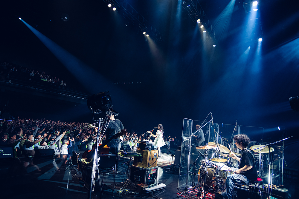 そして、このライブで特に印象的だったのは、「私がジャズに興味を持つきっかけになった曲」と紹介された「愛されたくて」からのジャズナンバーだろう。ベースがエレキからウッドに持ち替えた「愛されたくて」ではピアノソロから引き継ぐようなスキャットによりボーカルソロを展開。「遠吠え」ではピアノとハミングでデュエットしたかと思えば、イントロからファンクジャズのような新たなアレンジが施された「LAST SCENE」の後半では、エレキギターとエレキベース、グランドピアノ、ボーカルの4声が同じメロディを歌う合奏を展開。この3曲の演奏を終えた後、バンドメンバーはガッツポーズを見せ、「みんな、頑張ってきた甲斐があったね」と充実した表情を浮かべた有安とハイタッチ。改めて、有安のライブパフォーマーとしての表現力の多彩さを堪能できる時間となっていた。