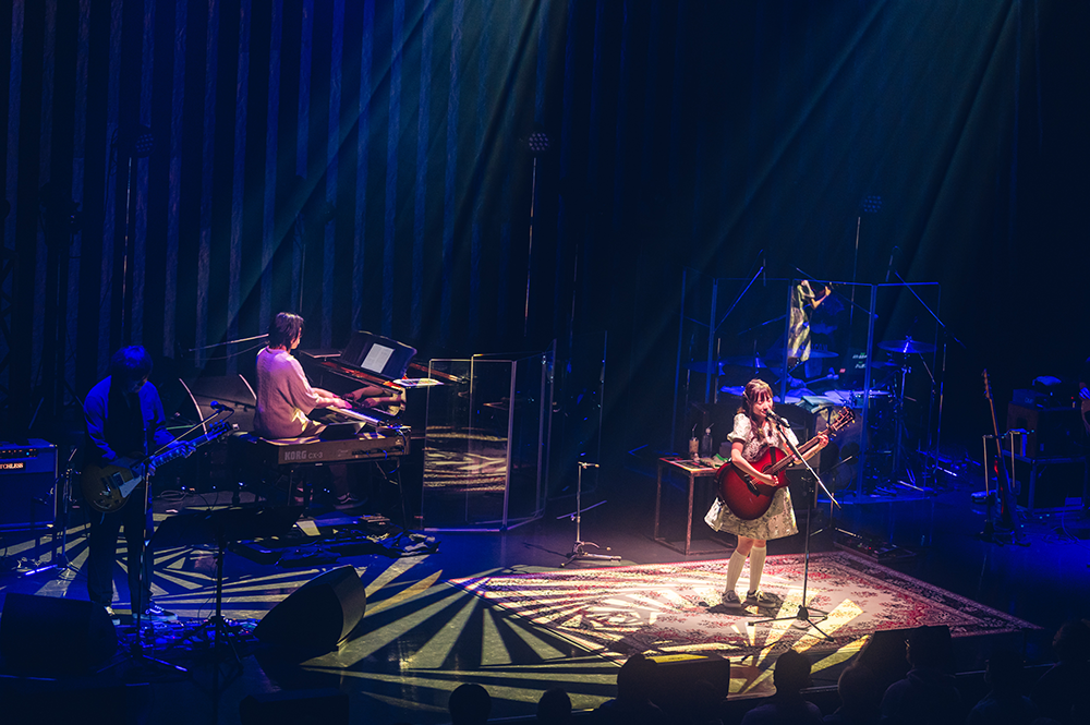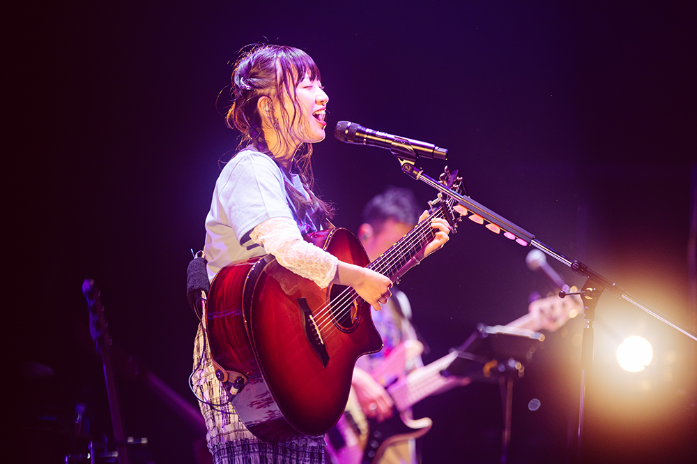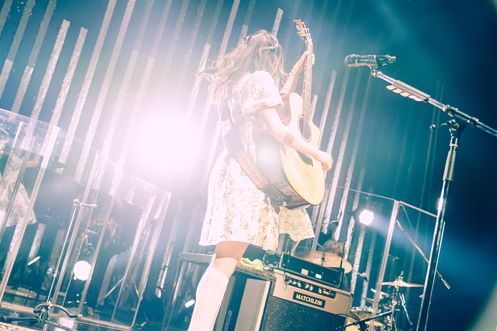 開演時間を迎えて場内が暗転すると、福原将宜(Gt)、松本ジュン(Pf)、川崎哲平(Ba)、玉田豊夢(Dr)からなるバンドメンバーが登場した。総立ちとなった観客からの温かい拍手で出迎えられたバンドメンバーがそれぞれの位置につくと、ピアノがメロディを奏で、ドラムとベースが加わり、最後にバンドマスターであるギターが音を鳴らし、5年半ぶりとなるバンドアンサンブルを提示。続いて、グループ時代のイメージカラーであるグリーンをベースにしたドレスにハイソックス、VANSのスニーカーを履いた有安がステージに現れ、アコースティックギターを抱えてスタンドマイクの前に立った。1曲目は彼女が作詞だけではなく、初めて作曲にも挑戦した、シンガーシングライターとしての始まりの曲とも言える「ハムスター」。左足でリズムをとりながらアコギをかき鳴らす有安の軽やかで実に楽しそうな歌声と手数の多いバンドアンサンブルが共鳴する中で、有安はアコギの残響音が残らないように素早くミュートして弦の鳴りを抑える仕草をするなど、楽曲全体を構築する音の細部にこだわりも感じた。