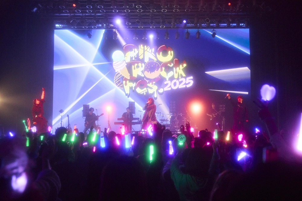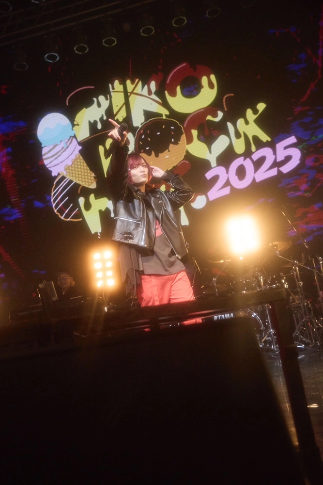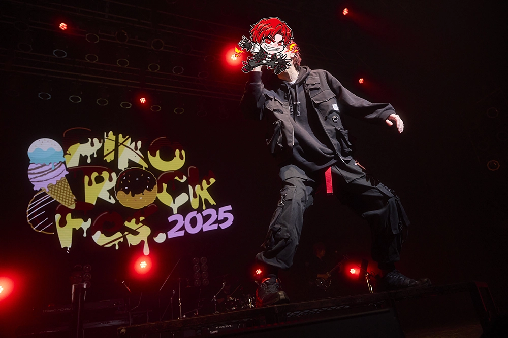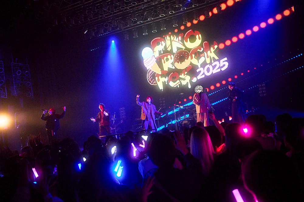 アイスクリームやドーナツ、ゴリゴリのROCKとは真逆にあるスイーツをポップにアレンジした今回のロゴをバックに、バンドメンバーが登場すると場内が暗転。ゲストの個性をとらえたかわいい描き下ろしイラストで出演者を紹介したあとは「PIKO ROCK Fes.、アゲてくぞ~」と叫びながら下手からピコが登場。“天樂をーー”と張りのある声で荒々しくシャウトをきめ、「天樂-双響-」を歌い出すと、観客からはoiコールが沸き起こり、冒頭からフロアはロックフェスさながらの盛り上がりで熱狂。得意のハイトーン、ビブラートを使って、この曲をエネルギッシュに歌いきったピコは「PIKO ROCK Fes.2025、始まるぜ~!」と幕開けを宣言。続けて「みんなテンション高いね」とナチュラルな笑顔を浮かべてフロアに話しかける。しかし、すぐさまロックモードにキャラ変して「今日はお前ら、みんなぶっ殺してやるよ!」「最後までぶっ飛ばしていくぞ」と観客をを挑発しまくり、次の神谷玲へとバトンタッチ。