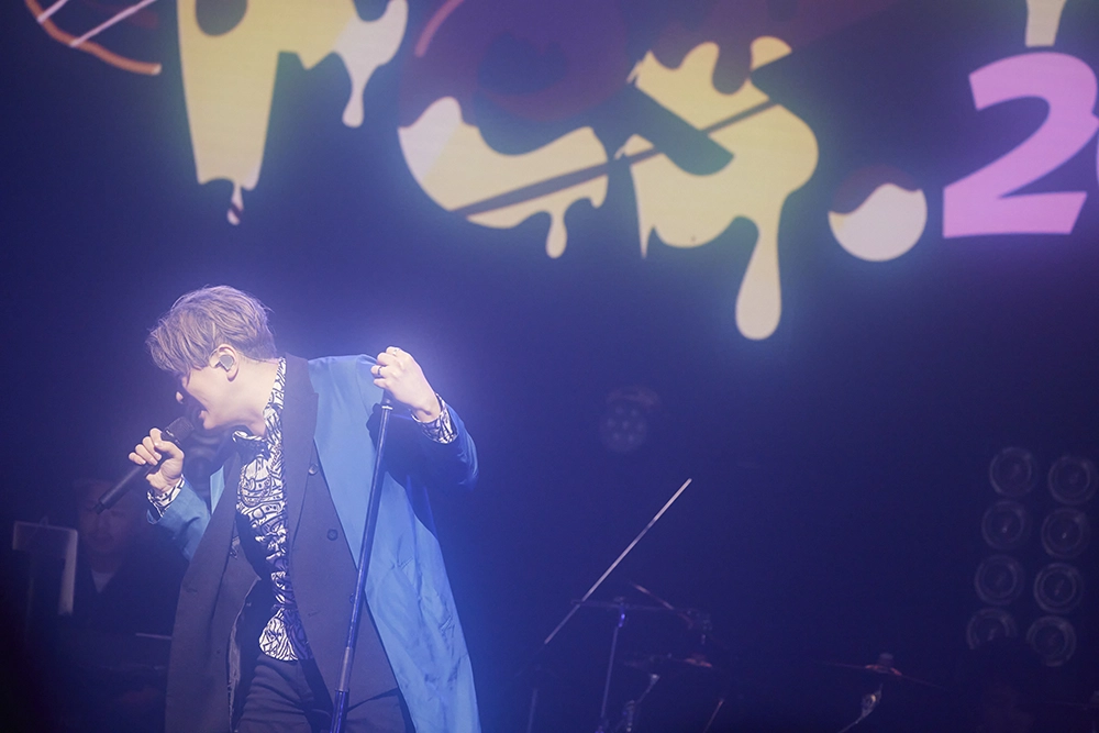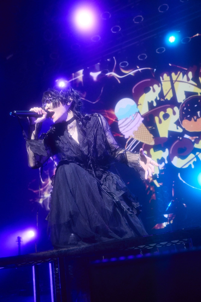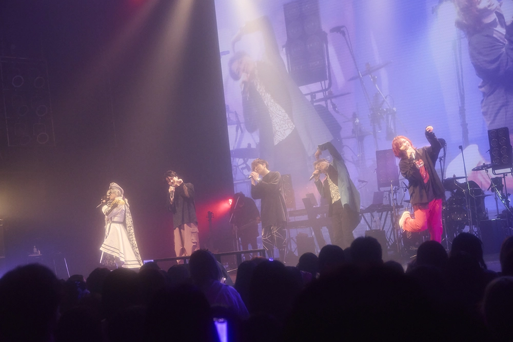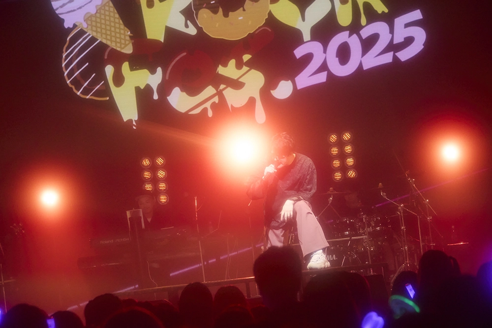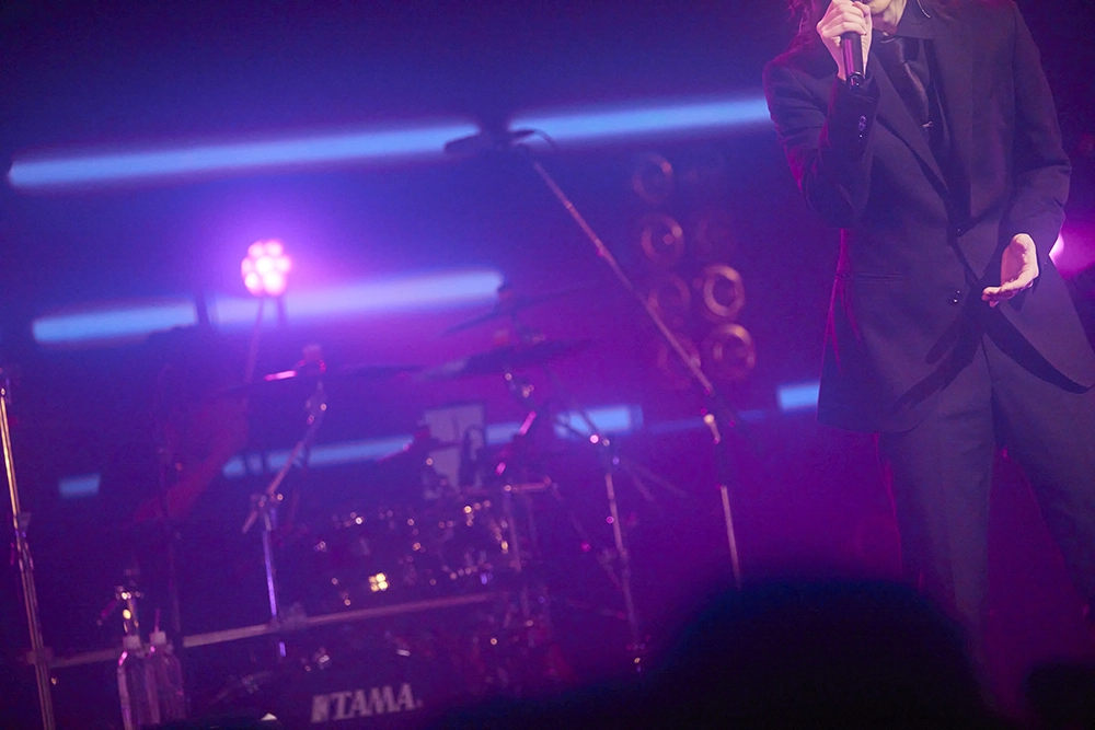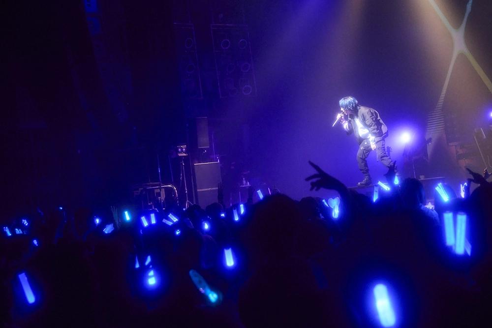 「毒占させていただきます」と低音の爆イケボイスを耳元に届けて挨拶をしたあと、始まったのはもちろん「毒占欲」。独占欲強めのアブないリリックを、ダンディーな声色で品格ある歌に変えていき、低音の響きを存分にフィーチャーした歌唱で、明らかにヤバめな妄想ソングを一途なラブソングとして届けていった。
