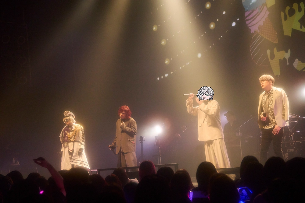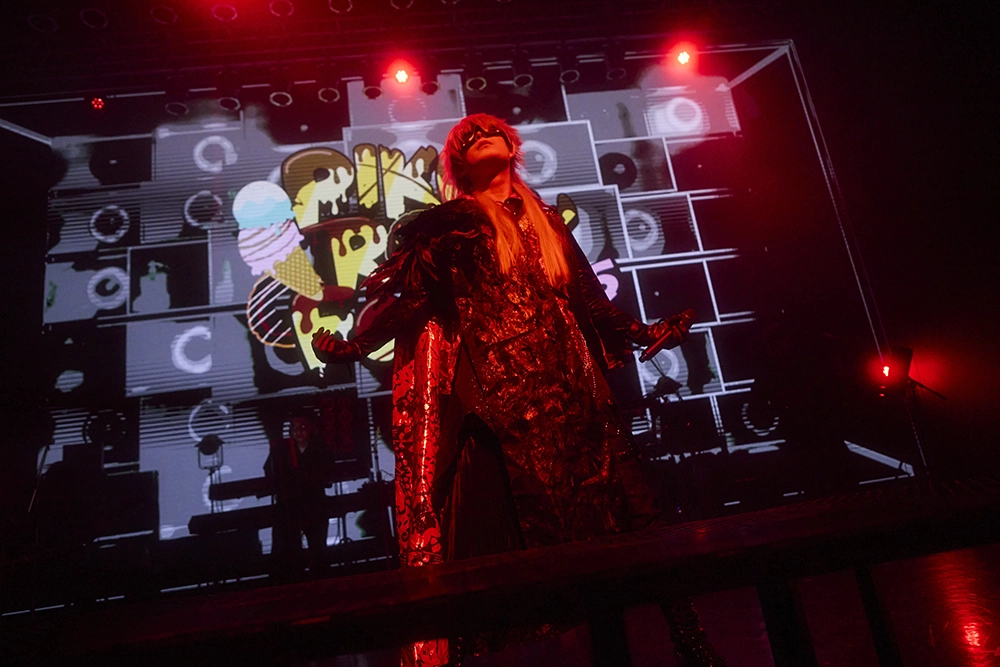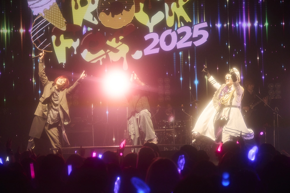 再び場内は暗転。アタック映像にアンダーバー・オルタのイラストが映し出されると、場内から悲鳴が上がり、空気が一転。アンダーバー・オルタは、“アンダーバー王のありえたかもしれないもう1つの未来”という設定から生まれたもの。アンダーバーから闇墜ちしたようなアクティングを交えながら、悲しみ、怒り、絶望を爆発させ「ORIGIN」を台詞のようにドラマティックに熱唱していくステージはまるでミュージカル!高熱量の歌とパフォーマンスでフロアを圧倒したあとは「この星の同志と歌う。来い、ピコ!」とピコを呼び出すと、アッパーの激情ロックチューン「Dearest,Dearest」が勢いよく鳴り響く。バンドの演奏も火がついたように燃え上がるなか、サビ後半では、王2人(!)が向き合い、ハモりを響かせるなど、2人の息の合ったパフォーマンスで場内のテンションを大いに上げていった。