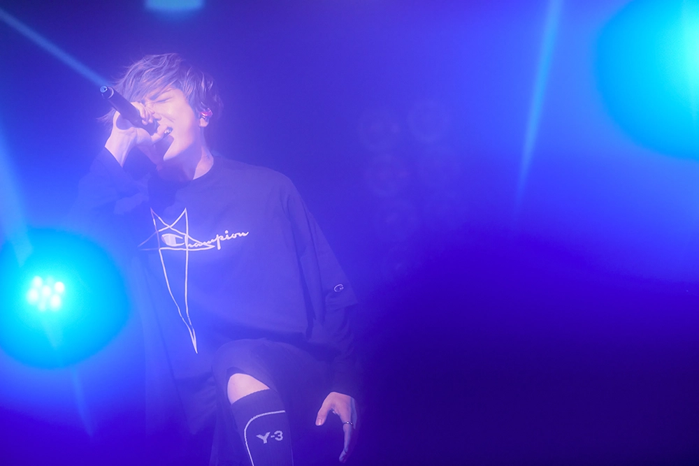 次はピアノの切ないイントロに誘われ、ゆっくりとうみくんがオンステージ。選曲したのは「命に嫌われてる」。重たいシリアスな歌詞を、観客に、そして自分にも突き刺すように歌ううみくんにフロアは一瞬にて釘付けになる。そうして“本当はそういうことが歌いたい“と叫んでからのこの曲クライマックス。“生きて生きて”を激しく連呼したあと、アウトロでピアノがなり響くなか、うみくんは「ウォイ! ウォイ!」と拳を振り上げて叫び、集まったオーディエンス一人ひとりの魂に“生きろ”というメッセージをたたき込んでいった。歌い終えたうみくんに、観客からは自然と拍手が送られた。