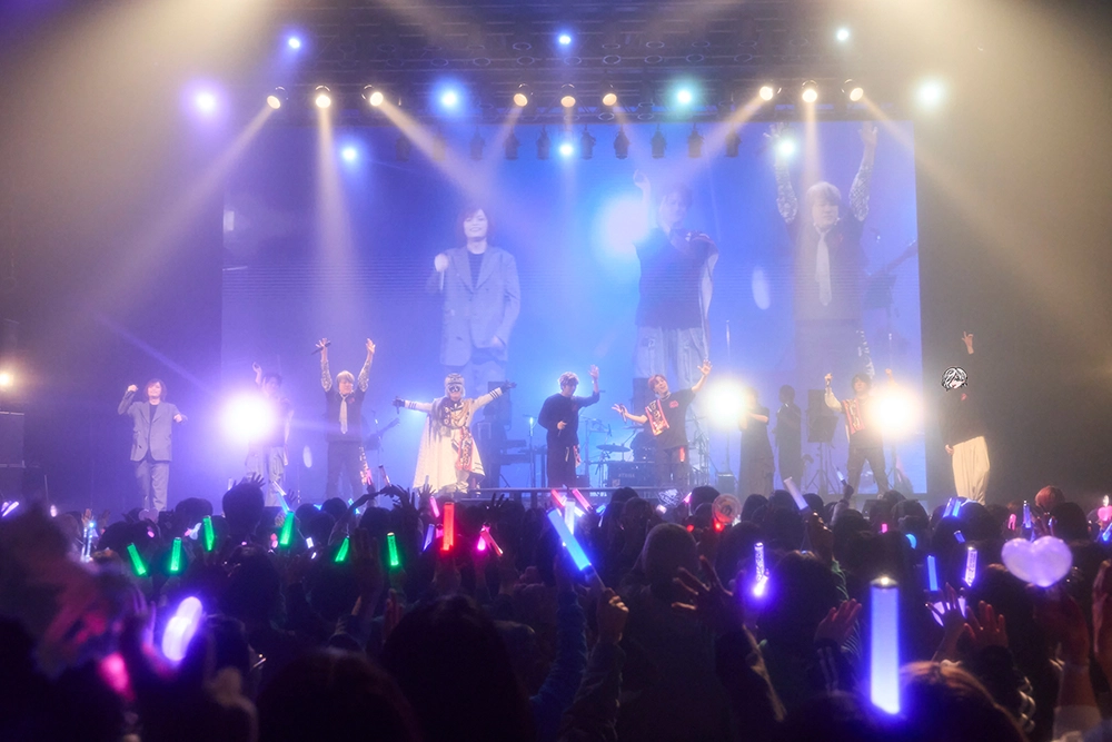 続いて、ステージにはボカロプロデューサー、サウンドプロデュサー、ソングライター、歌い手など、幅広い活動を行なう大ベテランのトゥライ(minato、流星P、湊貴大)が登壇。ピアノをバックにブレスを一つ入れたあと、ファルセットを使って彼が歌い出したのは「ブラック★ロックシューター」だった。観客から悲鳴が上がると、バックの画面に流星群が拡がり、その広大な夜空にスケールいっぱいに力強い歌声とロングトーンを広げてみせると、観客たちもペンライトの色をブルーに変え、フロアに夜空を作ってみせた。その景色を見て「よきですね」といいながら、舞台に姿を表わしたピコは「2人で一緒に歌う機会はないので」と話し、赤ピコでも歌っていた「magnet」を本人と一緒にカヴァー。ここでしか見られない貴重な共演に、フロアは大興奮。歌い終えたあとは「パパぁ~」、「息子よ~」と2人で小芝居をしながらステージを後にした。
