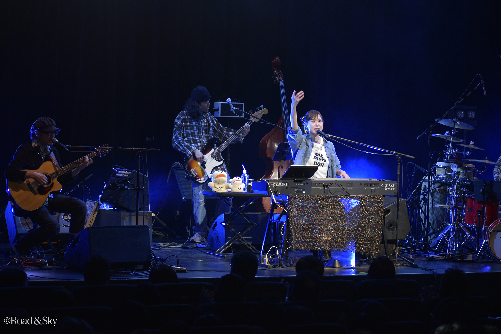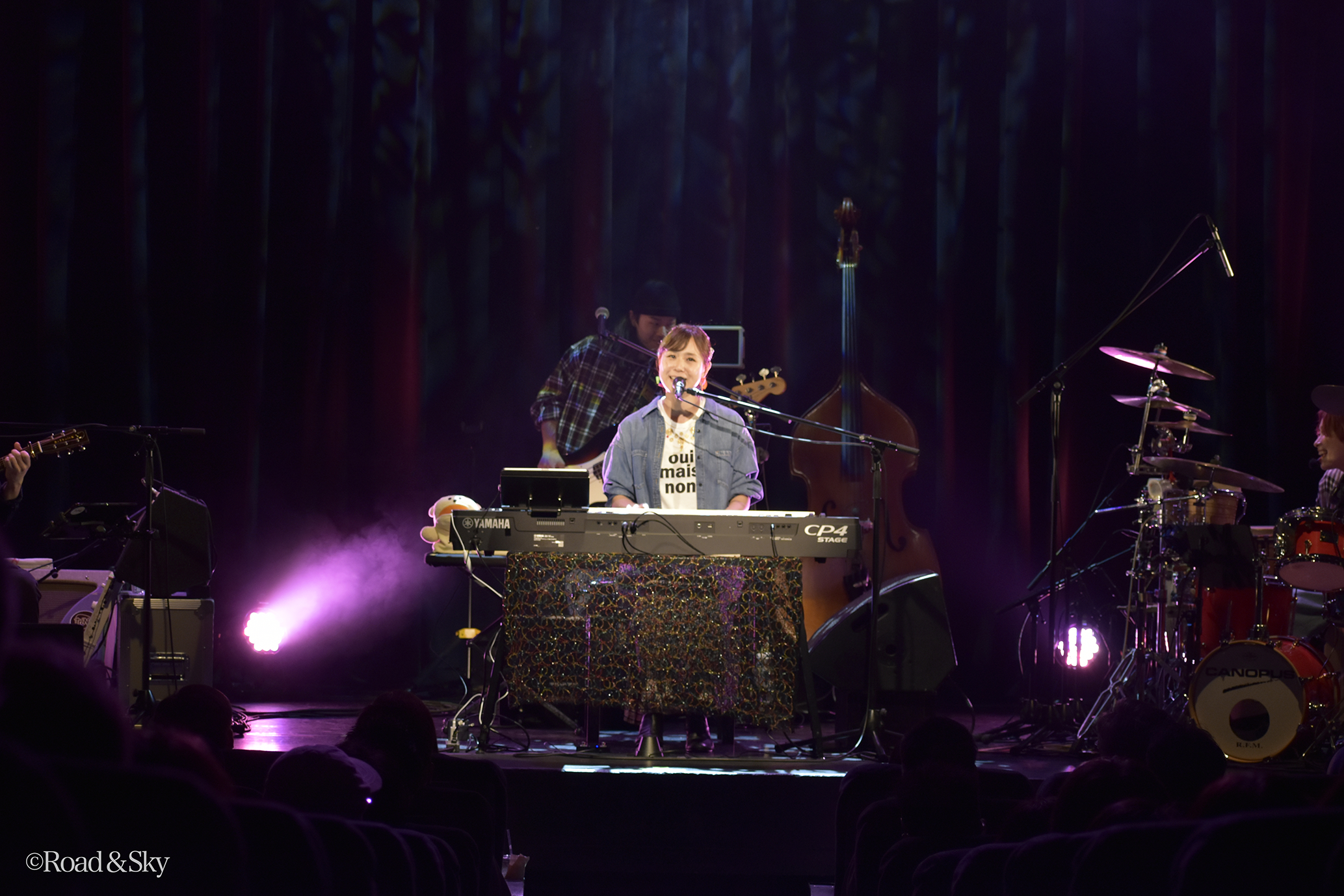 ピアノの音色が鳴り響き、やおら会場が暗転する。青い照明が灯るステージにサポートメンバーが登場し、中嶋がセンターのピアノ前に現れるとひときわ大きな拍手が沸いた。SEに若森がビートを重ね、観客もクラップで続くと「カンガルーファイター」でライブがスタートする。爽やかさと力強さのある演奏と、強い意志を感じさせる歌声は鮮やかに空間を色付け、中嶋のグリッサンドも痛快に響いた。