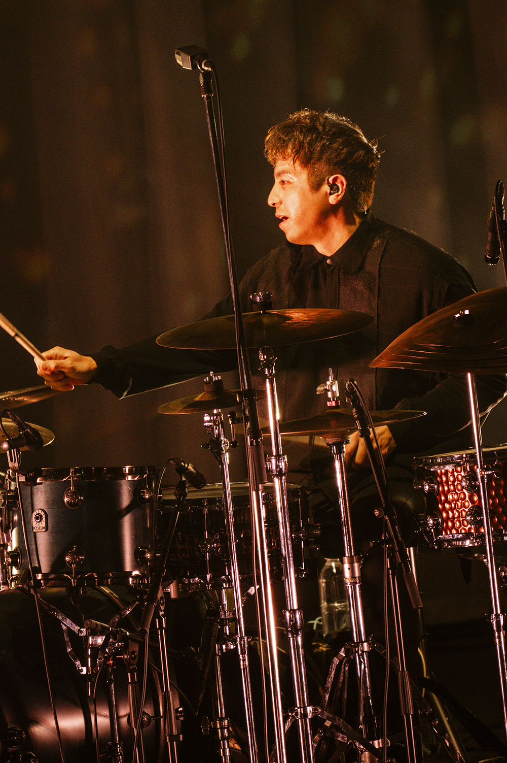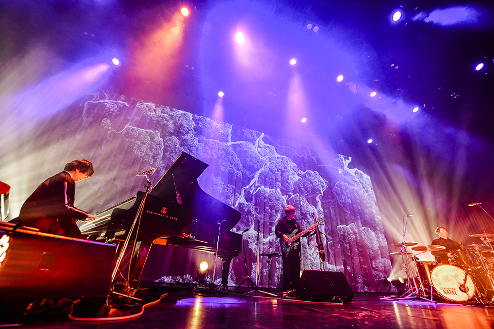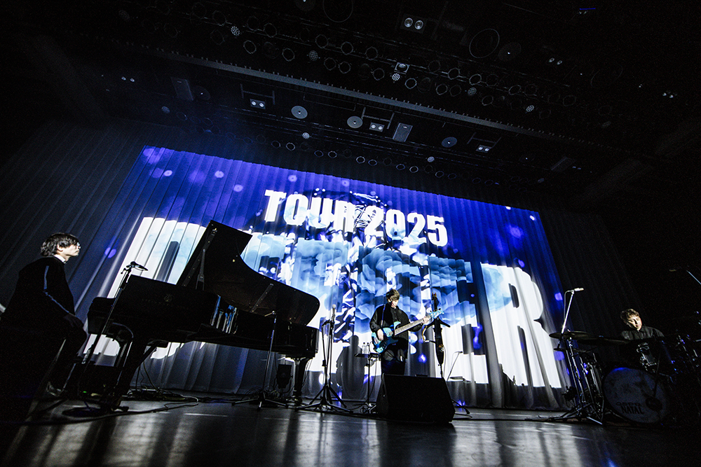 ツアー中で、最大キャパにも関わらずチケットはソールドアウト。満員の観客の熱視線の中、3人は「Deep Inside」「Tokyo」「Step’n」と、アルバムのオープニングを再現しながらぐんぐん飛ばす。彼らをジャズインストだと思っていた人は度肝を抜かれるだろう、激しくロックするリズムを叩き出す井上司(Dr)、ピアノとキーボードとシンセサイザーを駆使してカラフルなメロディを紡ぐ岸本亮(Pf)、中央でどっしり構える司令塔・カワイヒデヒロ(Ba)。この日本橋三井ホールでのライブはほぼ全曲で映像が使われ、今日のように広いステージでは迫力倍増。昨年、TVドラマのメインテーマとして書かれた「アンメット」での、まばゆいバックライトの使い方もかっこいい。耳も目もどっちも楽しい。
