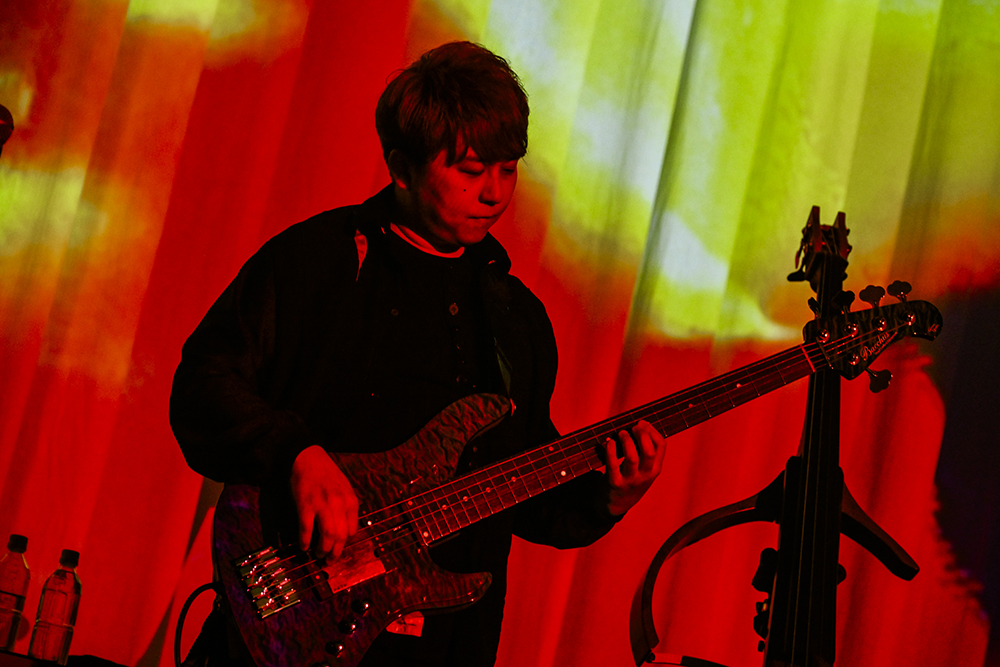 2012年リリースの「Flexible」を紹介する微笑ましいやりとりのあとは、再び『DEEPER』のディープな世界へ。岸本の「このあと、すごい変な曲ばっかり続くんで」という言葉通り、「The curtain of night」から「Strange Disco」へ、チルアウトなムードを経てファンクとジャズとロックが絡み合い、重厚なリズム隊と浮遊感覚のピアノが入り乱れて疾走しながら、井上のマシンガンビートがうなりをあげるファストチューン「Vortex」へなだれこむ。終わった瞬間、岸本が右手を高々と掲げてガッツポーズ。井上が「座って聴く曲じゃないね」と言って笑う。椅子があるのがもったいなく感じるほどの盛り上がりだ。