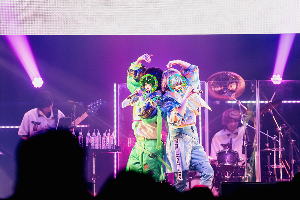 その後はアルバムに収録されている、すたぽら初のペアオリジナル楽曲のセクションへ。くにとCoe.によるロックナンバー「High and Low」は低音ラップとハイトーンボイスが情熱的に響き、Coe.とReluによる爽やかなギターロック「bestie」はハイトーンのハーモニーが夏の日差しのように眩しい。Reluと如月ゆうによるキュートなポップソング「愛鍵」は観客のコールも痛快で、如月ゆうとこったろによるシティポップのテイストが取り入れられた「星を辿って」は歌声から両者の真摯な気持ちが伝わる。こったろとくにによるセクシーなムードが漂う「Shall We Dance?」は歌詞のとおりの“魅惑のステップ”をダンスで見せて会場をときめかせた。