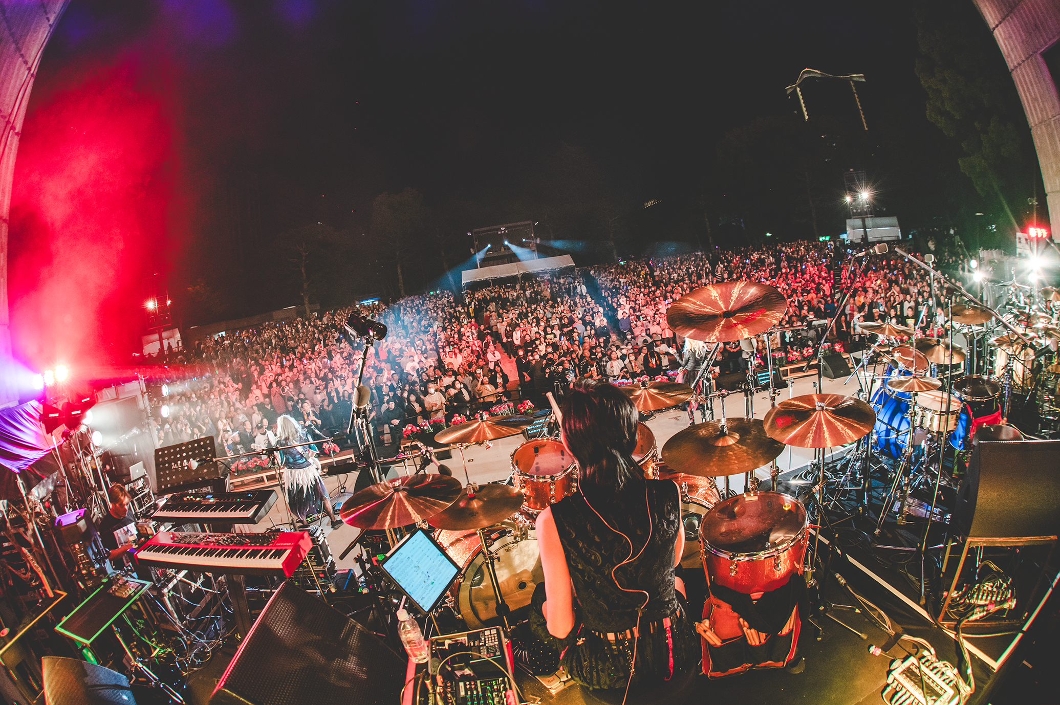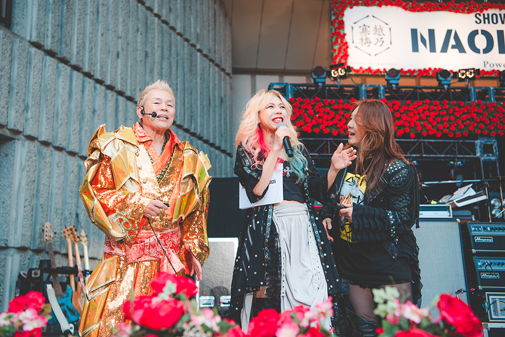『NAONのYAON』もいよいよクライマックス。すっかり陽が落ちた日比谷野音のステージを眩いライトが照らす中、堂々登場したのはSHOW-YA。ふりそそぐ光を浴びて、激しい演奏と強烈な存在感を放つボーカルで圧倒した「FAIRY」でライブの幕を開けると、「若い子と一緒にやりたいです!」と寺田がmayuと凪希を呼び込み「私は嵐」を披露。トリプルボーカルの迫力にヒートアップした観客から、拳と歓声が上がる!