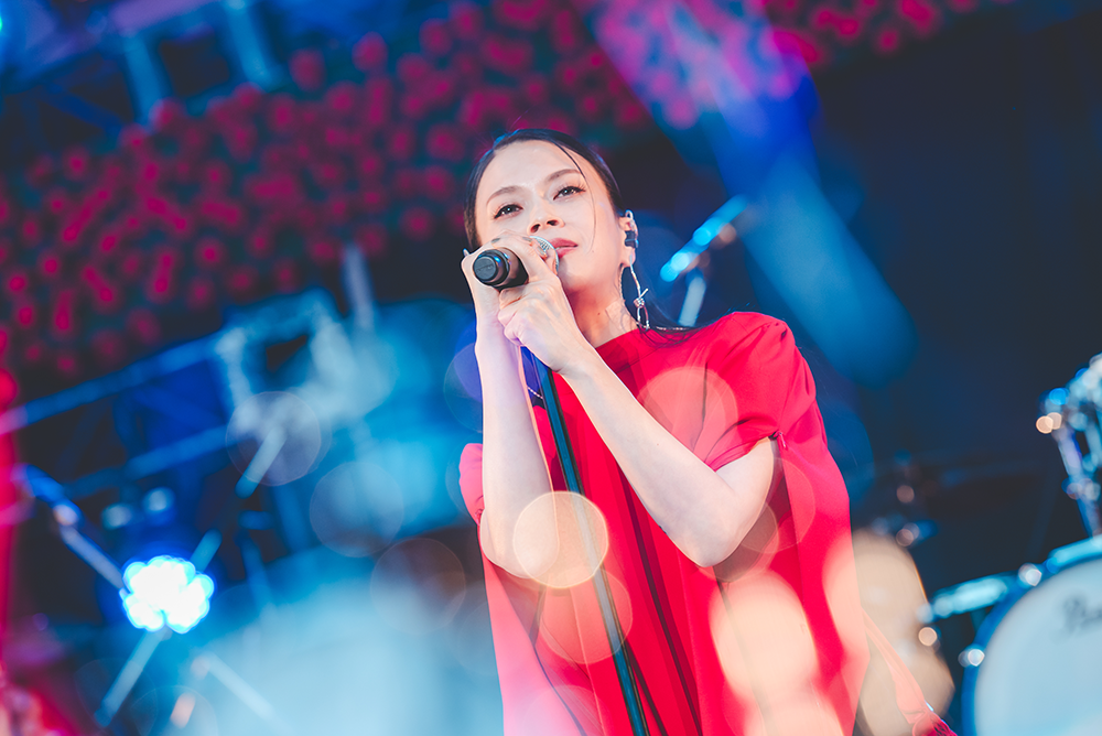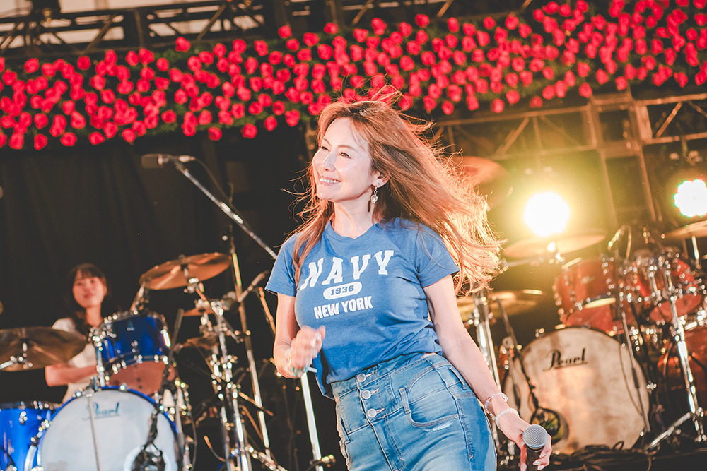 「be alive」でライブが始まるや、圧倒的な声量と歌唱力でその存在を知らしめたのは、小柳ゆき。「私のデビュー曲で、大事に歌い続けている曲です」と披露した「あなたのキスを数えましょう」、会場中がクラップや手振りを合わせて一体感を生んだ「愛情」と続き、会場を大いに沸かせる。