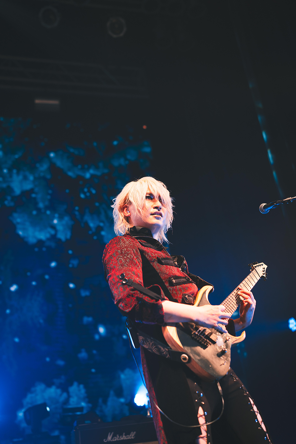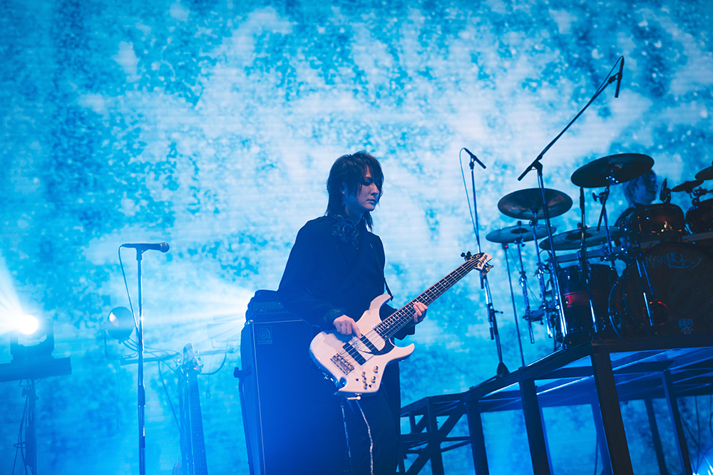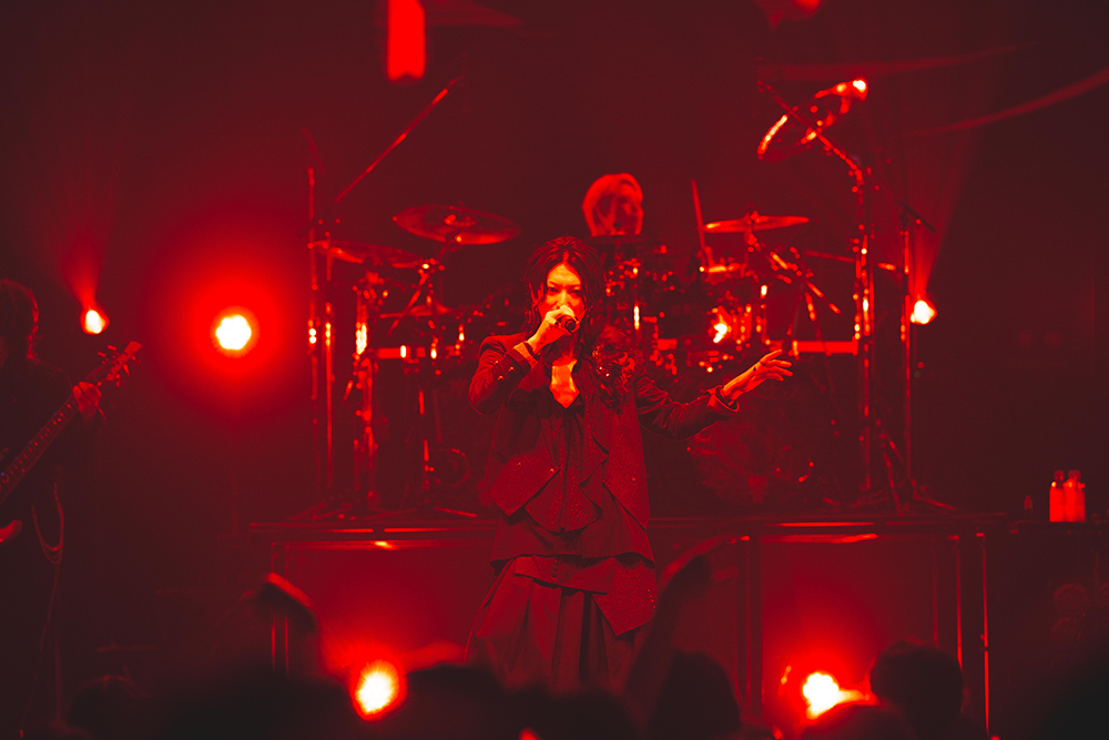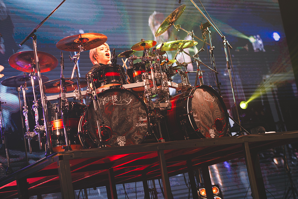 アルバムのリード曲「BLOOD」でライブが幕開けすると、オーディエンスはペンライトを赤色に灯し、フロアを血の色に染めてみせる。「DYSTOPIA」、「Ruthless」とアルバム冒頭を飾る3曲を曲順通りに演奏すると、響が頭から本領を発揮!手数も足数も半端ない連打を繰り広げると、ブラストビートがフルスロットルで炸裂。最新作の爆走メタルチューンを怒濤のように披露すると、フロアは、とたんにぶち上がる。ここに緩急をつけるように「Anemone」をプレイしていった彼ら。