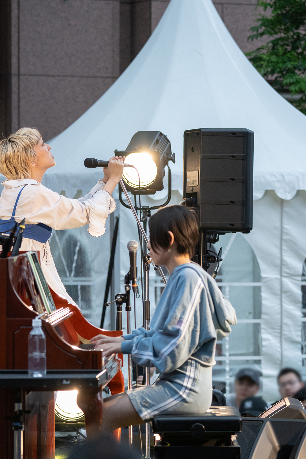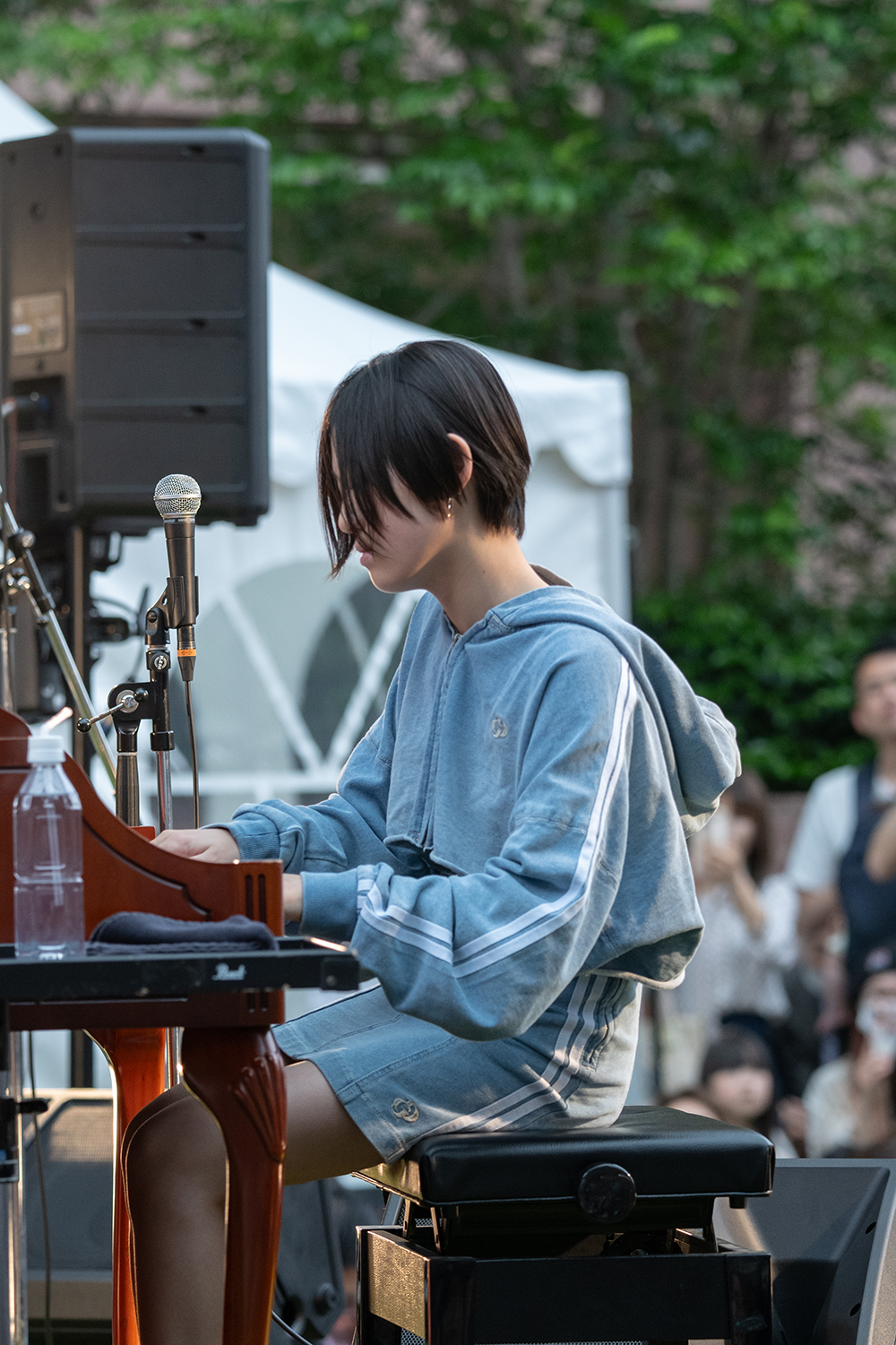 オンステージからオリジナル2曲をソロピアノで演奏。クラシカルな速いパッセージと複雑な展開を持ちながら、そこにしっかりとしたジャズの普遍性が息づいている楽曲は、その演奏だけでなく作曲面でも大器の片鱗を見せる。急遽決まったという海野雅威との連弾では、オスカー・ピーターソンの名曲「Hymn to Freedom」を情感たっぷりに演奏し観客を魅了する。目をつぶれば、演奏者が年端もいかない少女であることが信じられない貫禄のある演奏だ。海野のピアノに入れる合いの手もしっかりと会話になっており、古き良きジャズの心地よい風が恵比寿ガーデンプレイスを通り抜けていく。