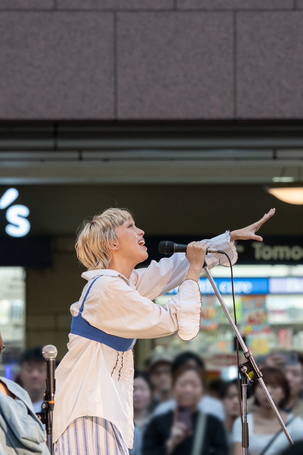 昨年リリースした「GINGUA」では、ループするウッドベースと観衆のクラップが力強いバックビートを作り上げる。Ai Furusatoのピアノは、オリジナルにはないリハモを加え、モノンクルのモチーフを借りつつもしっかりと個性を発揮していく。ステージにリズム楽器はなくとも、そこにはしっかりとしたグルーヴがあった。アコースティックセットでありながらも観客が吉田に合わせて振り付けをダンスできるというのは演奏者としての実力があればこそだ。