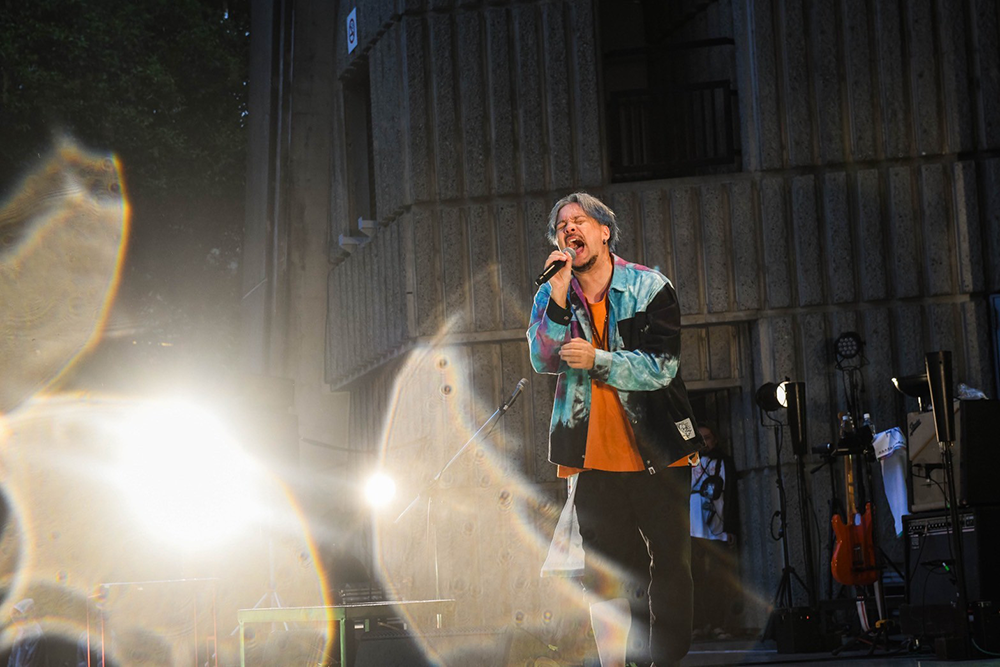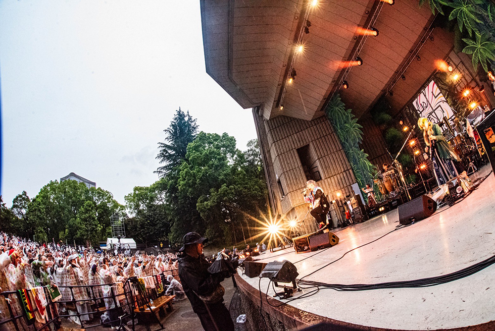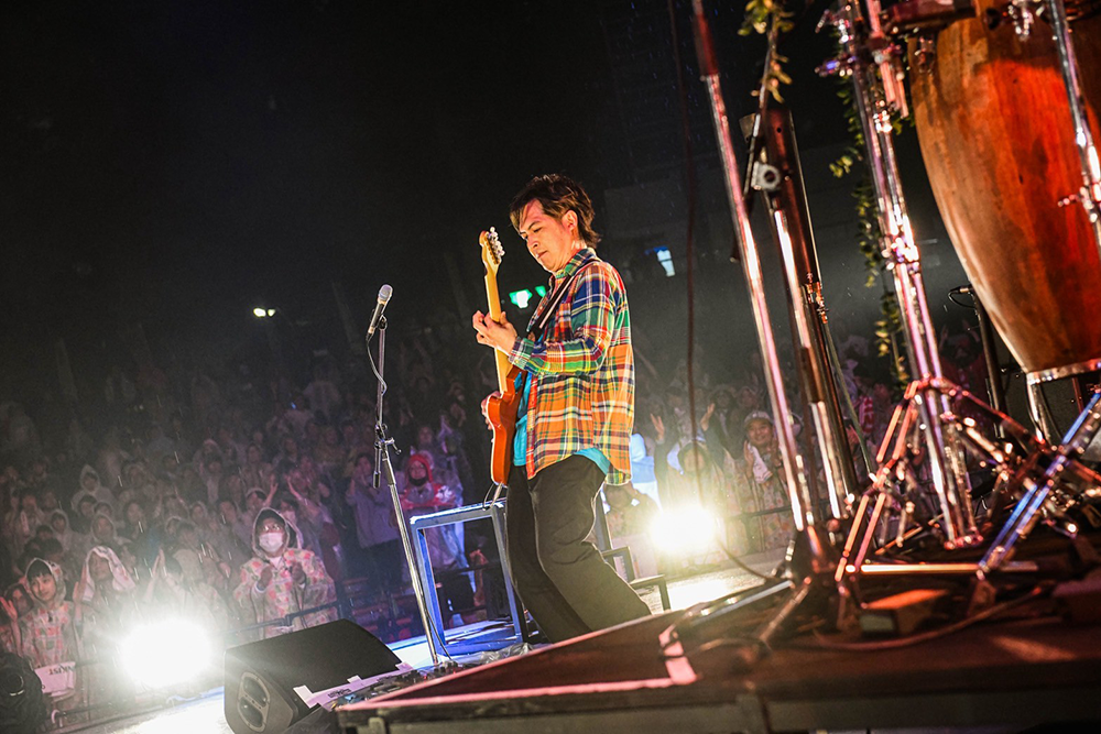 また雨が降り出した。切ないミドルバラード「パレード」から、染谷がアコースティックギターを弾きながら即興の歌詞を繰り出し、今日を喜び、子供たちを讃え、「愛のうた」へと繋げる。深い悲しみの中に一筋の灯りを探す、希望の歌だ。「出会ってくれてありがとう」と、泣きそうな声で染谷が叫ぶ。この雨がやむまで、君に伝えよう今、I LOVE YOUーー歌詞があまりにも景色に合いすぎてる。終わらない大合唱と優しい雨が、野音を包み込む。「世界中の偉い人たちにこの景色を見せてやりたい」と染谷は言った。この先何度も思い出すだろう、素晴らしい景色だ。