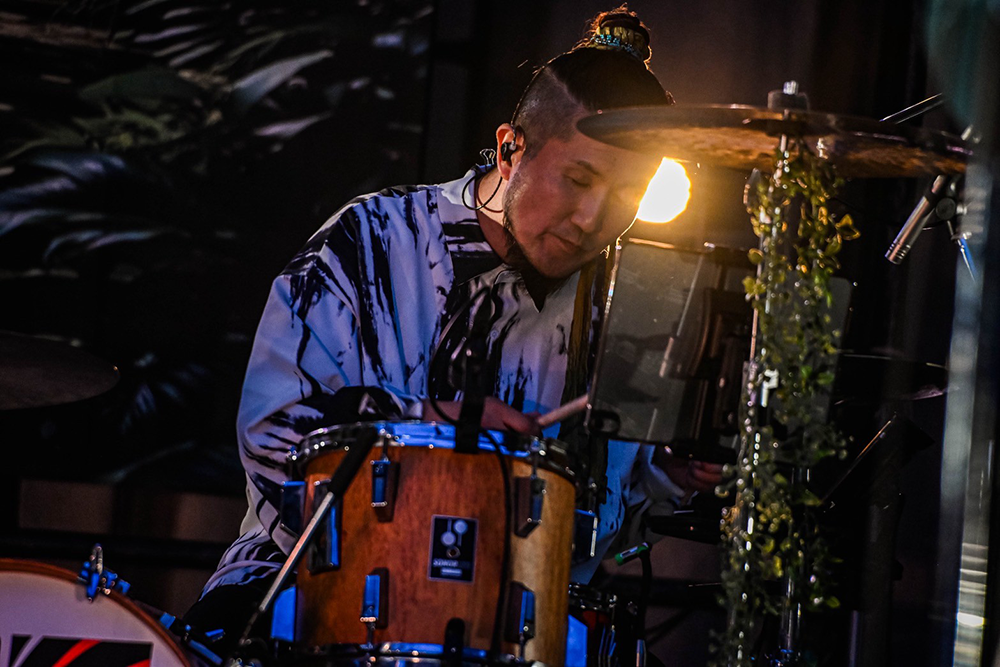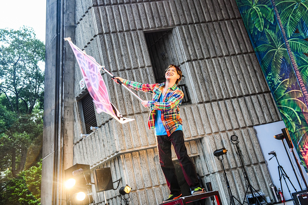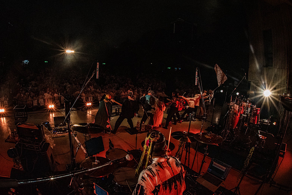宮田泰治とヨシロウがフラッグを高々と掲げて入場し、染谷西郷が強烈なアカペラ・ラップでパーティーの始まりを告げる。1曲目「BORDER」から振り上げる手と歌声とダンスが客席を埋める。「25年ぶんの音、今日はあなたと鳴らしに来た。全員で歌おうぜ」――フルート・世古美月、パーカッション・kouとドラムス・Yoco(from 二人目のジャイアン)、ベース・Kai(from FREEASY BEATS)の気迫あふれるプレイに、サポートという肩書は要らない。全員がFUNKISTだ。