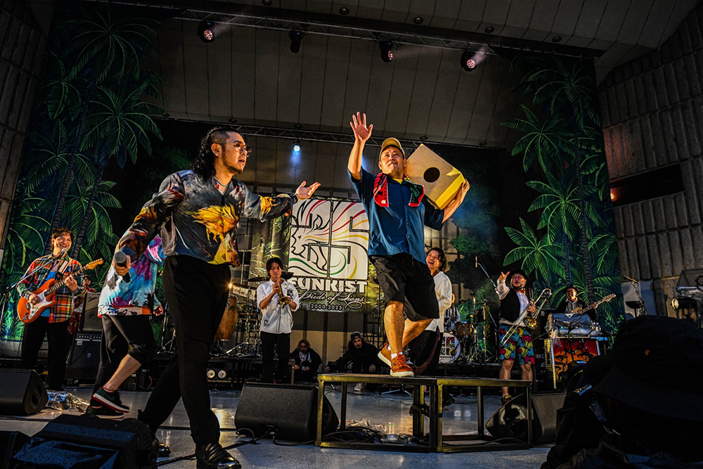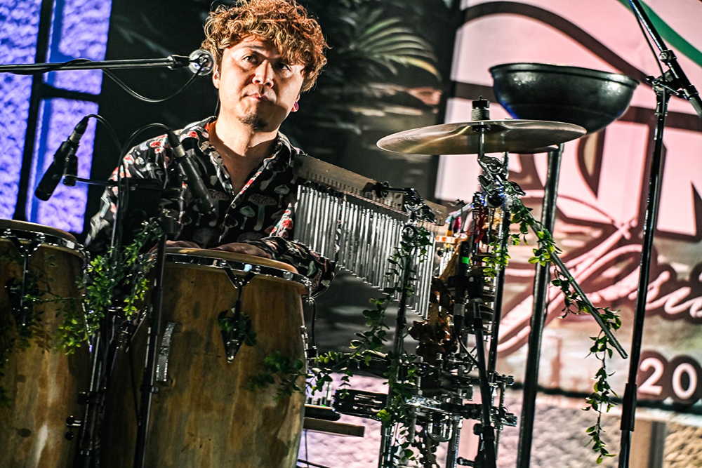 「ムーンライズカーニバル」から「沖縄」「ft.」へ、序盤はバンド初期の代表曲を連ねてぶっ飛ばす。揃いの振り付け、手振り、タオル回しでぐいぐい盛り上げ、世古とkouも前に出てガンガンアピール。ヨシロウのメランコリックなアコースティックギターが光る「sleep talking」をしっとり聴かせたかと思えば、「GO NOW」では二人目のジャイアンのホーン隊とボーカルMASA、さらにドロンズ石本もパーカッションで加わり、無礼講の大騒ぎ。もはやパーティーを超えるカーニバルだ。