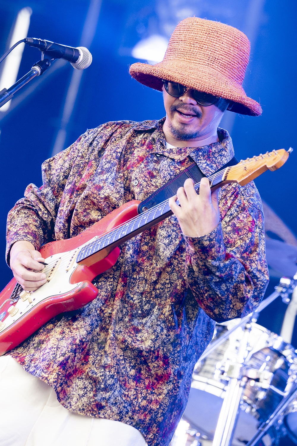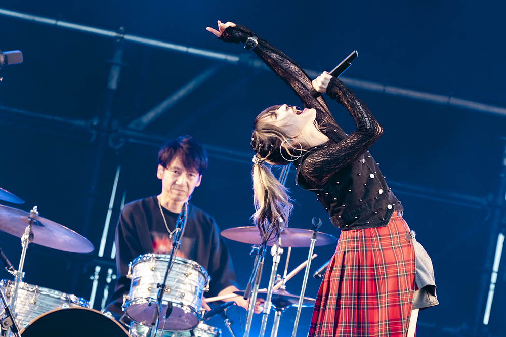 最初のMCでは「米フェスありがとうございます。今日は皆さんに音楽を届けに来たので、とにかく皆さん1人1人に届けていきたいと思います!」と熱い思いを吐露。アップテンポな「世界を蹴飛ばせ!」では上手ステージで、左の脚を高く蹴り上げるアクションも見せ、視線を釘付けにしていた。空をつんざく激しいギターで展開した「FREEDOM~Never End~」では、お立ち台に登って、右手の拳を振り上げながら何度も「FREEDOM!!!」と連呼。照明で真っ赤に染まった舞台で、全身で思いを伝え聴衆を燃え上がらせた。