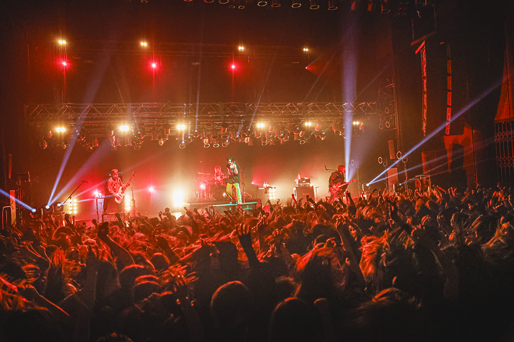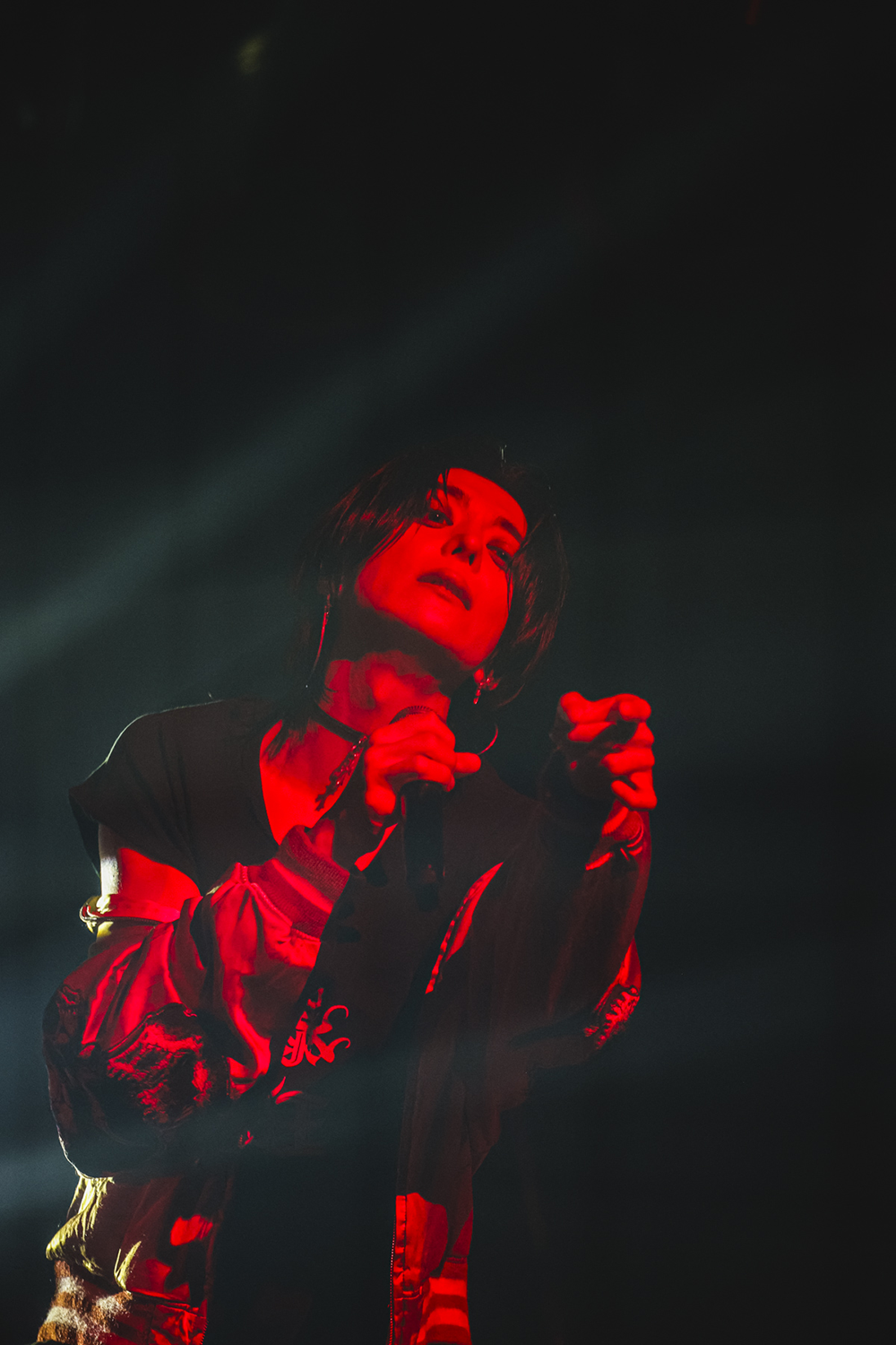 文(Gt)、義(Ba)、啓(Dr)の3人が凄まじい重音を解き放つと、そこへ咲が姿を現し、届けられた1曲目は「愛の地獄」。ヘヴィなミディアムナンバーで一気に深淵まで引きずり込んでいく展開だ。低く降ろされたステージ頭上の照明から、緑色の光が凄まじいスピードで降り注ぎ、フロアではヘッドバンギングが巻き起こる。「躾」では、咲が不気味な声色を切り替えながらフロアを調教するように扇動すると、愛と狂気が紙一重な主人公の心情を表すように曲調が変わっていく「故に、ドエス。」へ。文が奏でる奇怪ながらも耳にこびりついて離れないギターリフと、ヒステリックに叫び散らかす咲のパフォーマンスでフロアを魅了すると、アウトロでは「お前は俺のもんや!」と咲が連呼。そして凄まじい絶叫から「バッド入る」へなだれ込む。感情が昂った啓が立ち上がってフロアを煽れば、義はフロアを見渡し、盤石でありながらも凶暴な音塊を疾駆させていく。流麗なピアノの旋律がダークなサウンドをドラマティックに盛り立てる「堕天」では、咲が2本のマイクを使い分けながら歌を届けていた。