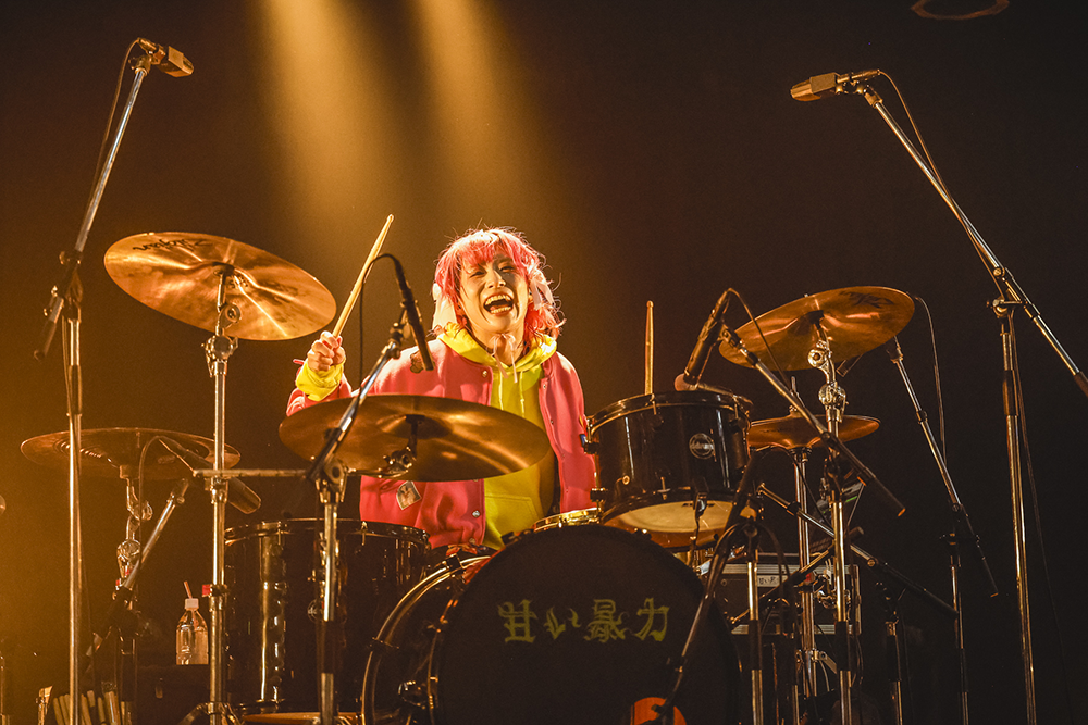 ライヴ中盤では「噛み痕」や「知りたく無い」を披露。それまでのバイオレンス全開なパフォーマンスから一転、どっしりとした演奏と感傷的なメロディをじっくりと聴かせていく。この日のMCで、「巷で噂されている甘い暴力のイメージだけじゃなくて、歌もちゃんと届けたいんだよ」と咲が話していたのだが、確かにここまで書いてきたレポートも、見る人によってはいかにも恐ろしい記述が多かったかもしれない。ちなみに、彼らは次回のツアーをすでに告知しているのだが、タイトルは『甘い暴力 クソプレゼンツ ドM限定 大調教会』だ。どう考えても狂暴すぎるライヴになることが予測されるし、一見さんが二の足を踏みそうな雰囲気も存分にある。しかし、甘い暴力は心の底から湧き上がる欲望を勢い任せでただぶつけるのではなく、メンバー1人ひとりが情熱を120%表現できるスキルと、そんな4人がひとつの塊となって突き進んでいくバンド力を持っていて、彼らが音楽に、バンドに、オーディエンスに対してどれほど真摯に向き合っているかは、ライヴに来れば一目瞭然。それゆえに「君が幸せでいてくれることが、私の幸せに繋がるわけじゃない。」に綴られた繊細で切実な思いが、心の奥底まで響いてくるのだ。