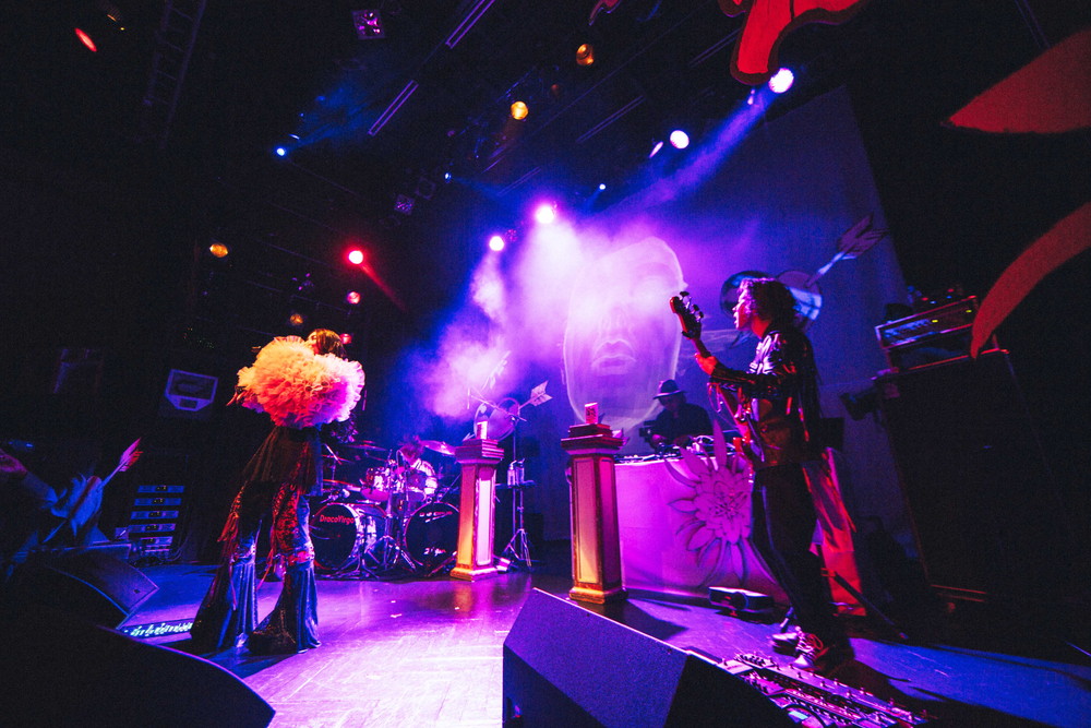 階段状のスタンディングの客席を上から下まで埋めた観客が見守る中、開演時間ぴったりに街の喧騒が聞こえ始める。ライヴは夢と現実、陰と陽が入り混じる町=オポチュニシティーに迷い込んだDJ Massがとある店のショーウインドーに並んでいた3体のマネキンに息を吹き込むという芝居仕立てのオープニングからファンクポップな「xxxx」に雪崩れ込むようにスタート。そこから1時間30分、バックドロップにさまざまな映像を映し出しながら、ステージの4人はMCも挟まず、ほぼノンストップで全16曲を披露した。
