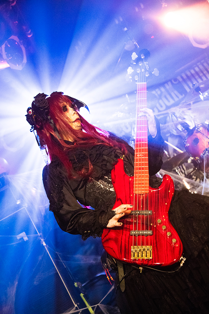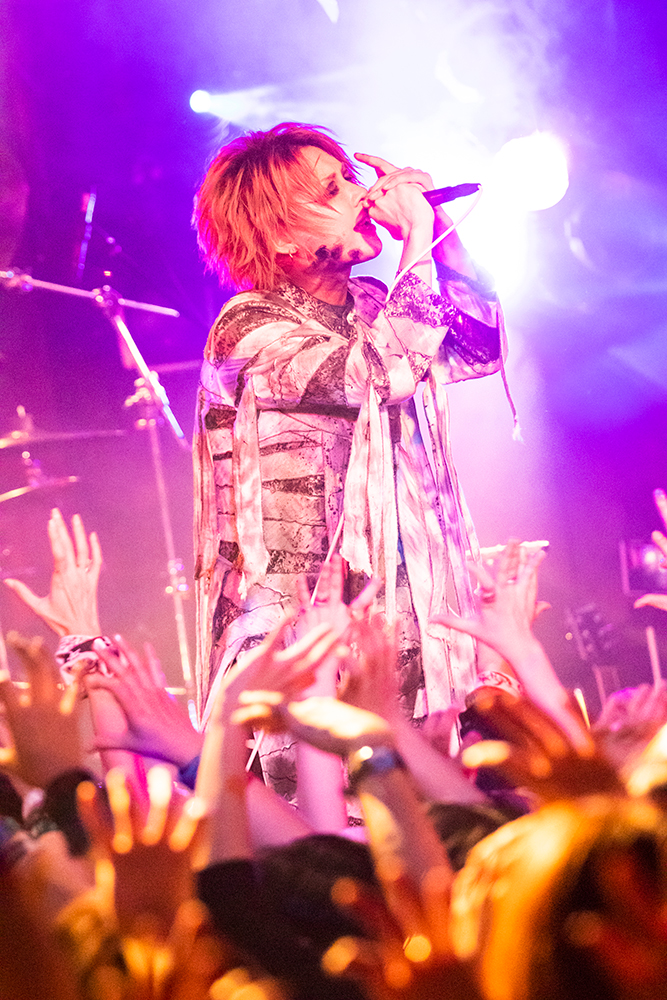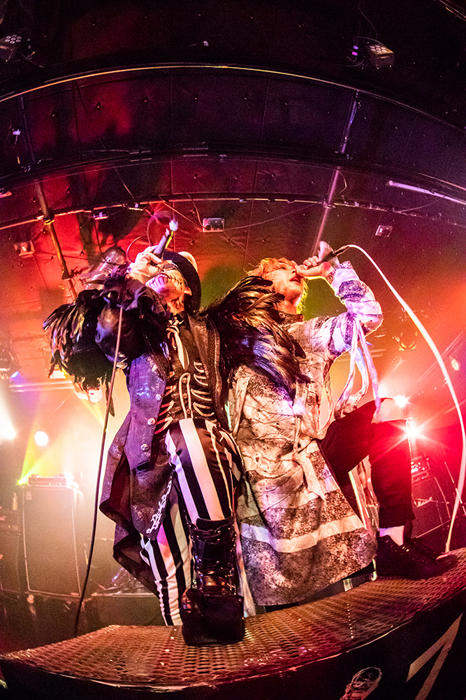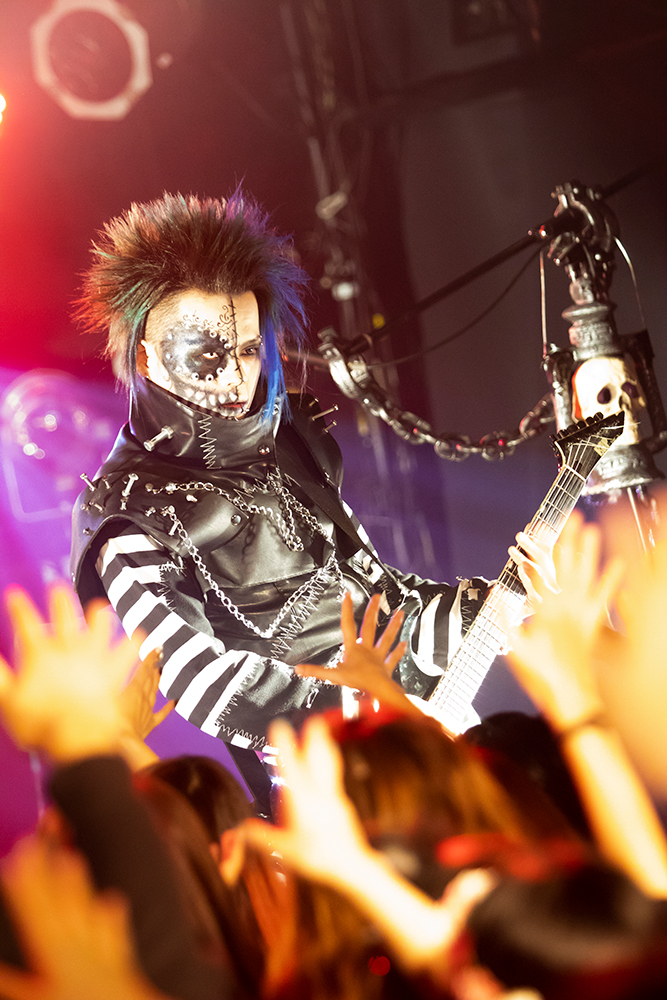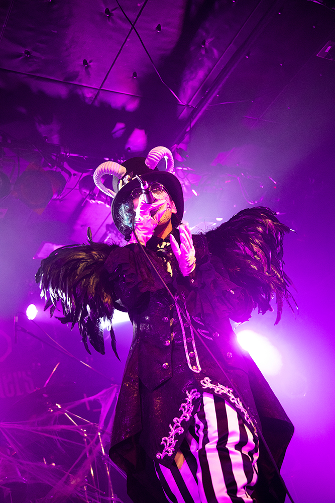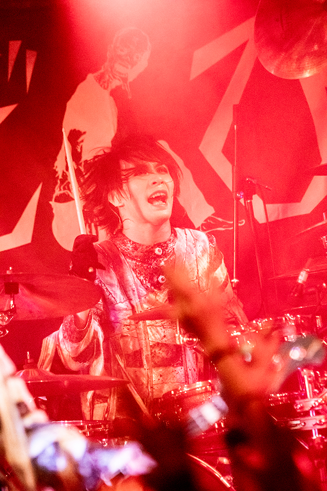と、ステージに張られた黒い幕がゆっくりと開かれるとEuskyss(B)、DieWolf(Dr)、Yo'shmeer(G)が奏でるゴースト感漂うサウンドの上に、D13が宴の始まりを告げる唄を載せて行く。ライヴというよりも、壮大なSHOWの始まりを予感させるその確固たる世界観は、ヴィジュアル系というジャンルを遥かに超越した場所にあるLeetspeak monstersというジャンルの確立に思えた。