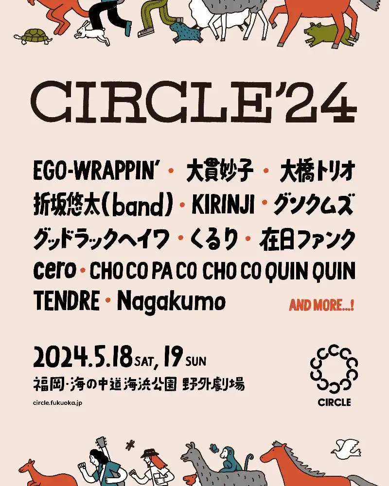 5月18日(土)19日(日)福岡県 海の中道海浜公園 野外劇場にて、昨年、記念すべき10回目の開催となった野外音楽祭「CIRCLE」の11回目を開催が決定し、EGO-WRAPPIN'、大貫妙子、大橋トリオ、折坂悠太 (band)、KIRINJI、グソクムズ、グッドラックヘイワ、くるり、在日ファンク、cero、CHO CO PA CO CHO CO QUIN QUIN、TENDRE、Nagakumoの13組の出演者が発表された。