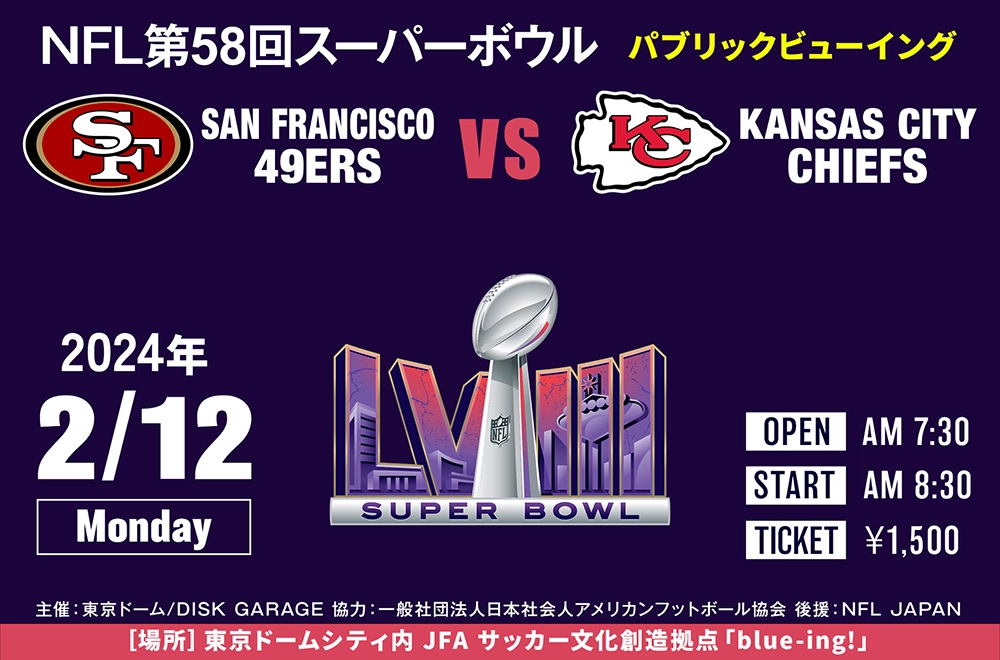 全米が注目する最大のスポーツイベント「スーパーボウル」のパブリックビューイングの開催が決定。今年はサンフランシスコ・49ersVSカンザスシティ・チーフスの対戦となる。