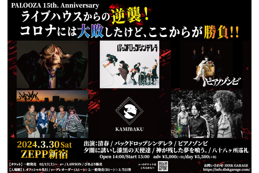 清春、バックドロップシンデレラ、ピアノゾンビ、夕闇に誘いし漆黒の天使達、神が残した夢を喰う。、八十八ヶ所巡礼 出演。柏PALOOZA 15周年記念イベント開催に向け、店長・楠美和也氏のコメント到着