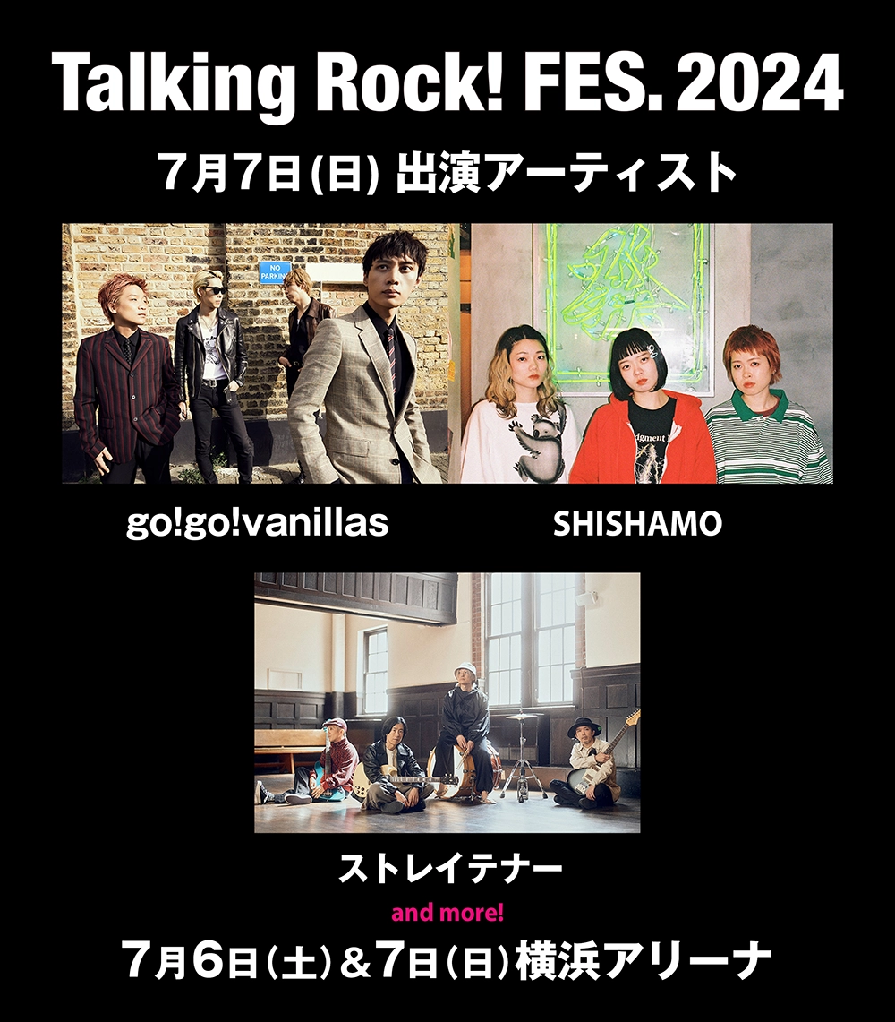 今年も横浜アリーナで開催する音楽雑誌「Talking Rock!」の主催イベント『Talking Rock! FES.2024』の第1弾出演アーティストの発表です。今回は各日3組ずつで、7月6日(土)にSUPER BEAVER、ハルカミライ、04 Limited Sazabys が。そして7月7日(日)に本日発売の最新号=Talking Rock!24年5月号の表紙アーティストのSHISHAMOと、go!go!vanillasに、ストレイテナーの出演が決定。チケットの一般発売は6月8日(土)からですが、その前にオフィシャル先行受付(抽選)がスタート(4月21日(日)まで)。なお、同フェスは今回で通算10度目の開催で、それを記念して、いつものステージプランにプラスのお楽しみを計画中。その内容や、さらなる追加アーティストの情報は、同フェスHPと本誌HP&本誌Xで後日アナウンスいたします。