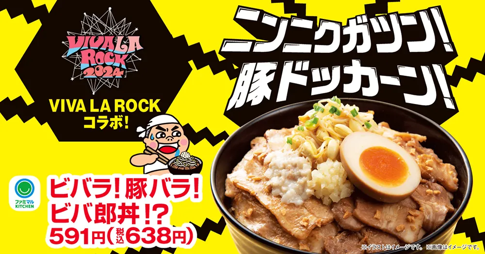 さらに、今年もファミリーマートで、ビバラがプロデュースしたお弁当の販売が決定。ガツンとしたニンニクのパンチ⼒とボリューム満点の豚バラがたまらないロックな丼「ビバラ!豚バラ!ビバ郎丼!?」を4⽉16⽇(⽕)より、埼⽟県全域、ならびに茨城県・栃⽊県・群⾺県・千葉県・東京都・新潟県の⼀部のファミリーマート、約1,700店で限定販売となる。