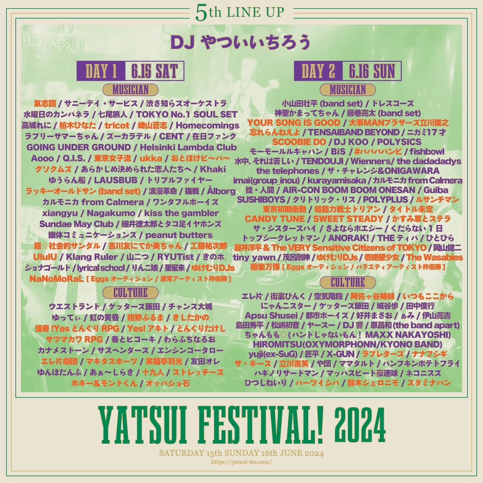 今回の発表ではやついフェス初出演の大物ミュージシャンから常連の出演者、期待のニュールーキー、今一番会いたいアイドル、濃いお笑いメンバー。Eggsとコラボしたオーディションの優勝者とまで多数の出演が発表された。