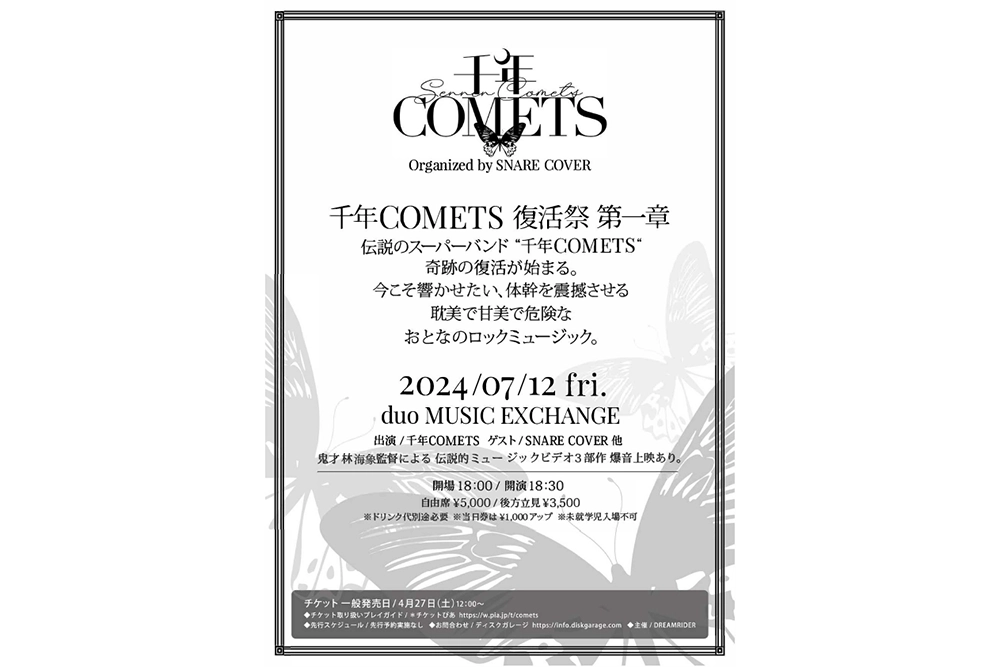 1987年CBS SONY(現在のSONY MUSIC ENTERTAINMENT)から衝撃のデビューを果たした日本ロック史のあだ花、千年COMETSが遂に本格始動。
