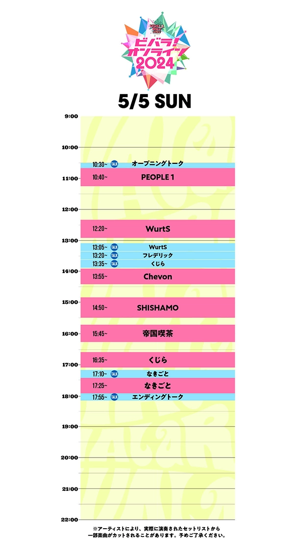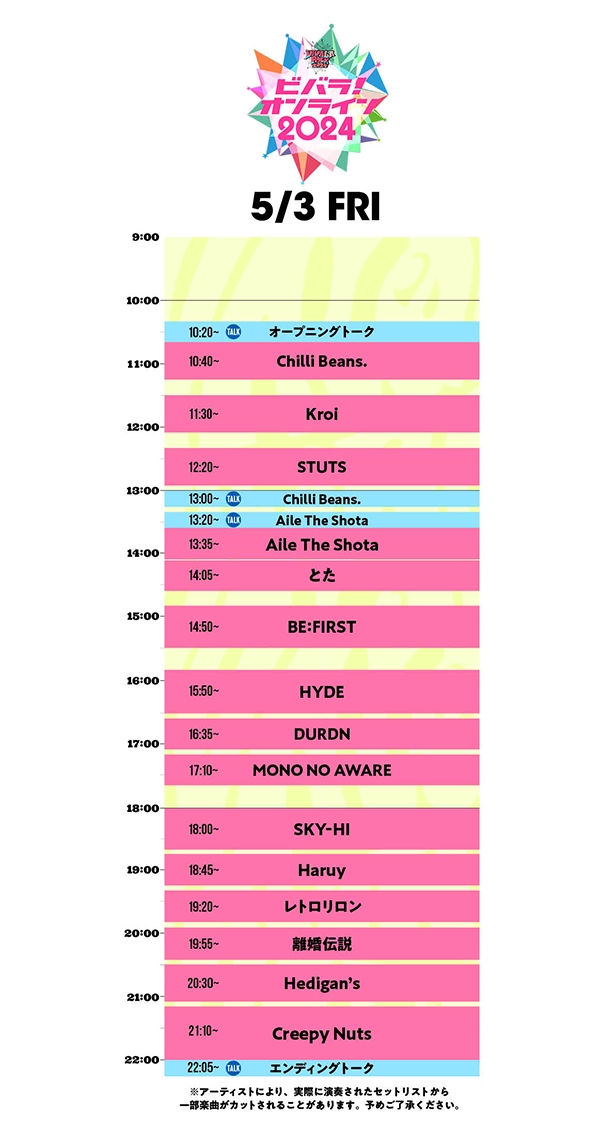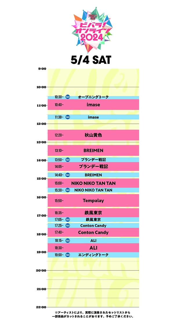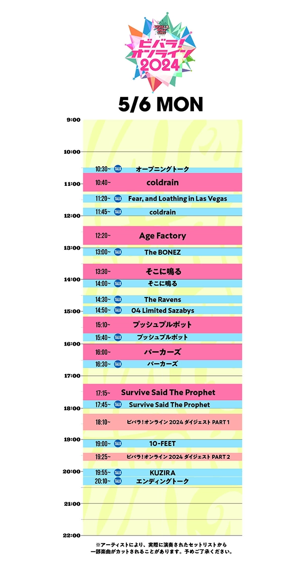 VIVA LA ROCK 2024と同時開催となる有料⽣配信「ビバラ!オンライン 2024」の最終ラインナップが発表されるとともに、ライブ配信37組+トークセッション24組で構成される、今年の「ビバラ!オンライン 2024」のタイムテーブルが公開された。
