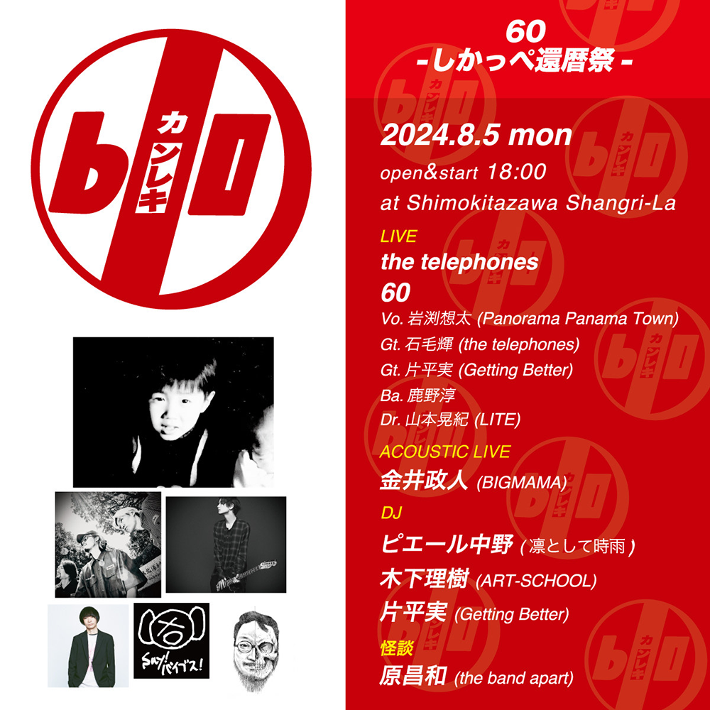 還暦を祝うべく鹿野と縁が深い、主催の片平実(Getting Better)、石毛輝(the telephones)、岩渕想太(Panorama Panama Town)、金井政人(BIGMAMA)、木下理樹(ART-SCHOOL)、the telephones、原昌和(the band apart)、ピエール中野(凛として時雨)、山本晃紀(LITE) などによるこの日だけのスペシャルなライブ。