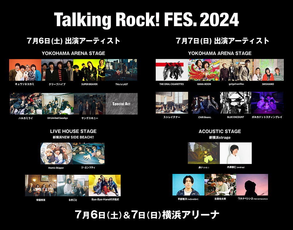2024年7月6日(土)、7日(日)に、毎夏恒例のTalking Rock!主催イベント『Talking Rock! FES.2024』が横浜アリーナにて開催される。