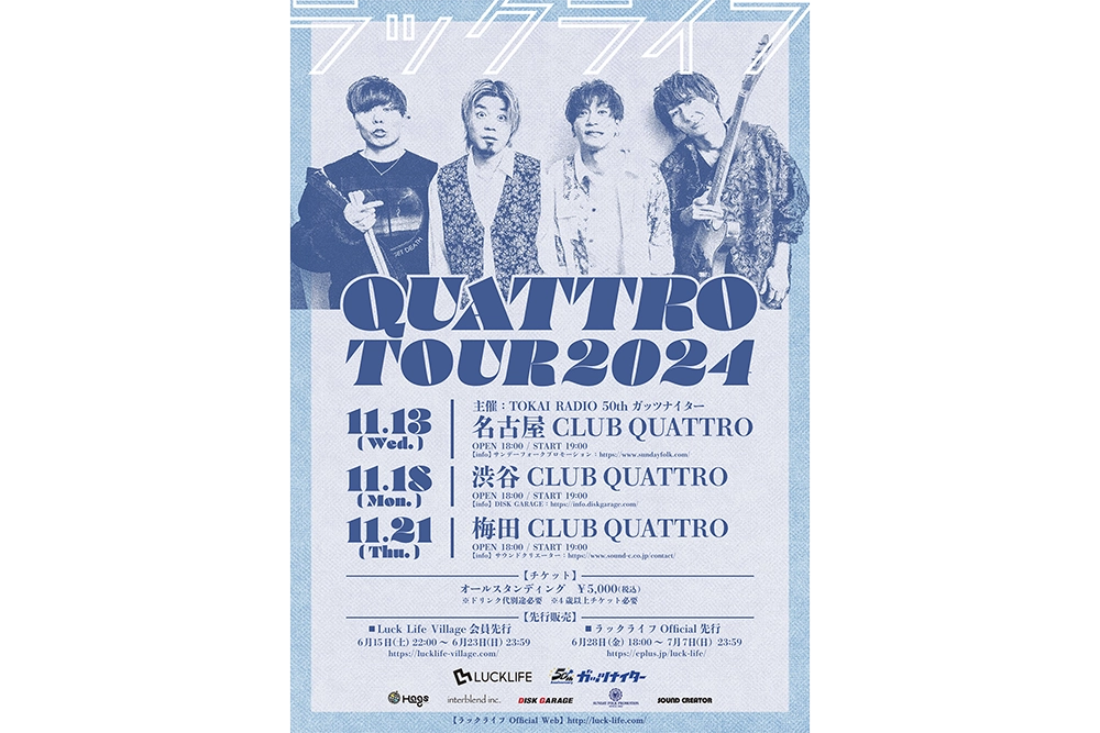 ラックライフが先週末6月15日(土),16日(日)の2Daysで今年10回目となるGOOD LUCK 2024を地元大阪BIGCATで開催し、Day1のアンコールMCで東名阪QUATTRO TOUR 2024を発表。