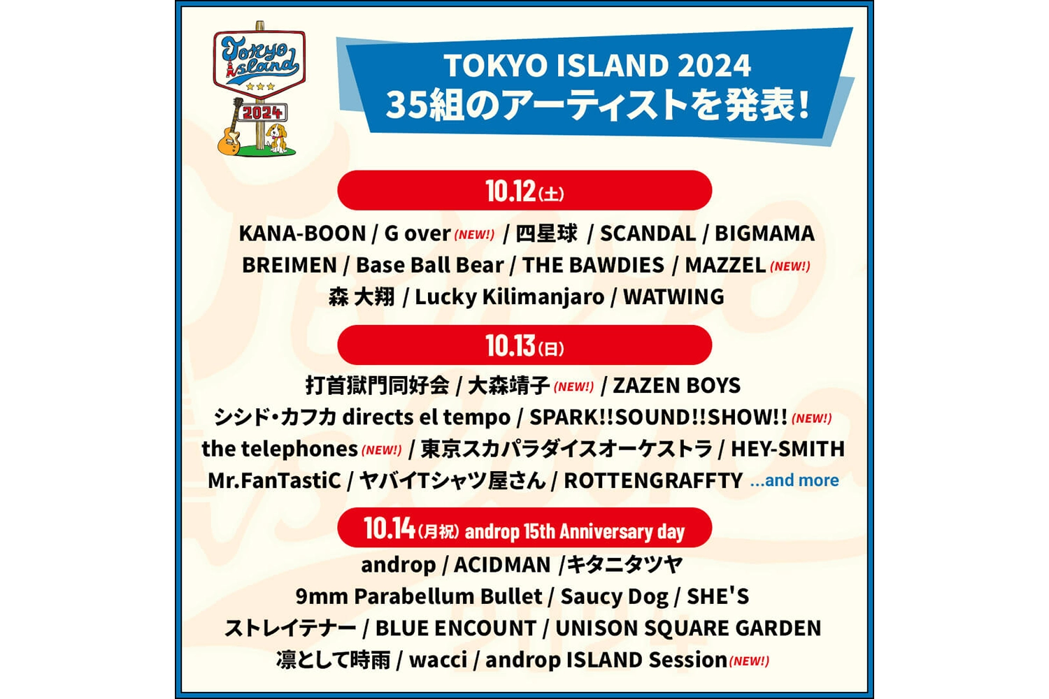 10月12日(土)はG over、MAZZEL。10月13日(日)は大森靖子、SPARK!!SOUND!!SHOW!!、the telephones。10月14日(月祝)はandrop 15th Anniversary dayのスペシャル企画としてandrop ISLAND Sessionを発表。これにて合計35組が出演日とともに発表されたことになる。