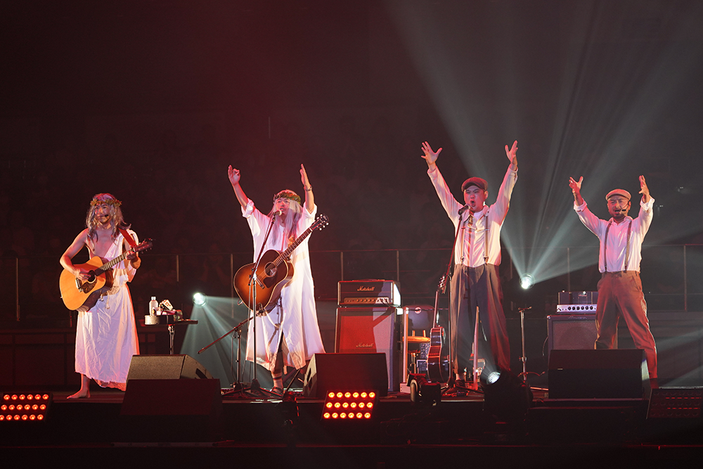 まず初日。過去の『ひとり股旅』は、作務衣姿で頭にタオルを巻き、座ってアコースティク・ギターを弾きながら歌唱する、というスタイルだったが、この日の奥田民生(以下OT)は、「森の神様」の出で立ちで登場。仁王立ちでギターを弾き始めると、「農夫」に扮した浜崎貴司が登場し、ふたりでどぶろっくの「キングオブコント2019」の優勝ネタ「農夫と神様」を歌い始めた。途中から、本物のどぶろっくのふたり=森慎太郎と江口直人も登場し、曲に加わる。2023年・2024年のどぶろっくの対バンツアーの東京公演にOTが出演、共にこの曲を歌った、という縁から、今回のこのオープニングが実現した、と思われる。