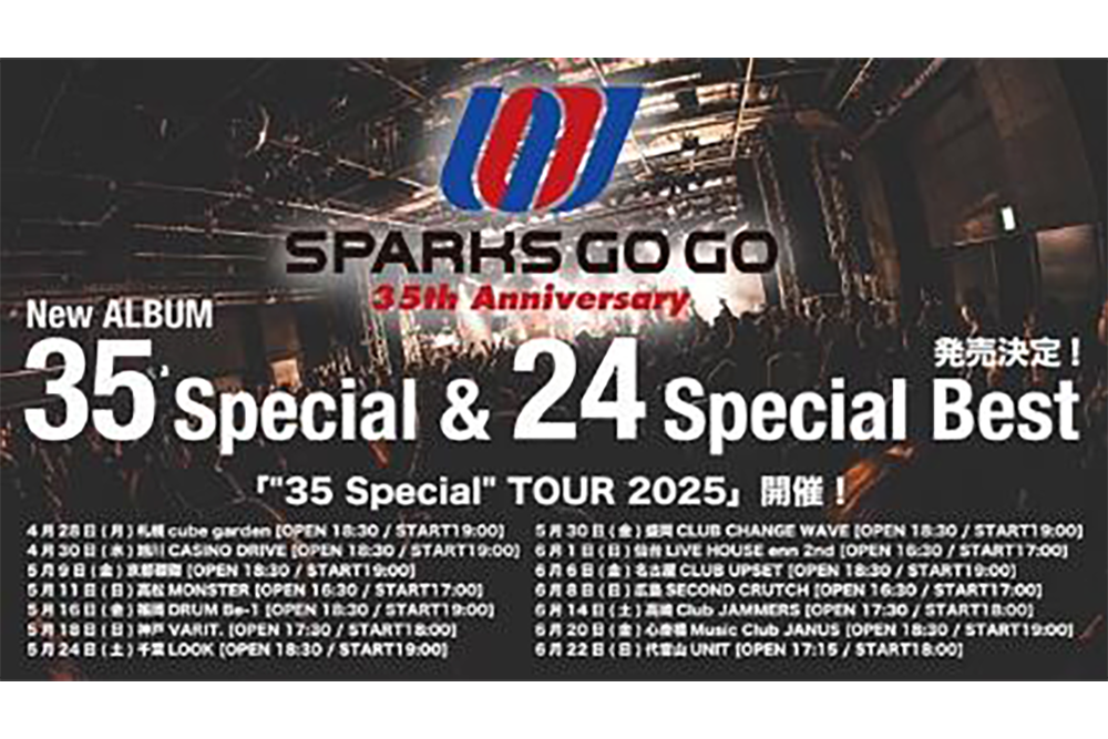 4月28日札幌を皮切りに全国14か所を巡る全国ツアー「"35 Special" TOUR 2025」のチケットは15日18:00からオフィシャルHPにて先行受付が開始されている。35周年を迎え、さらに加速するSPARKS GO GOをお見逃しなく。