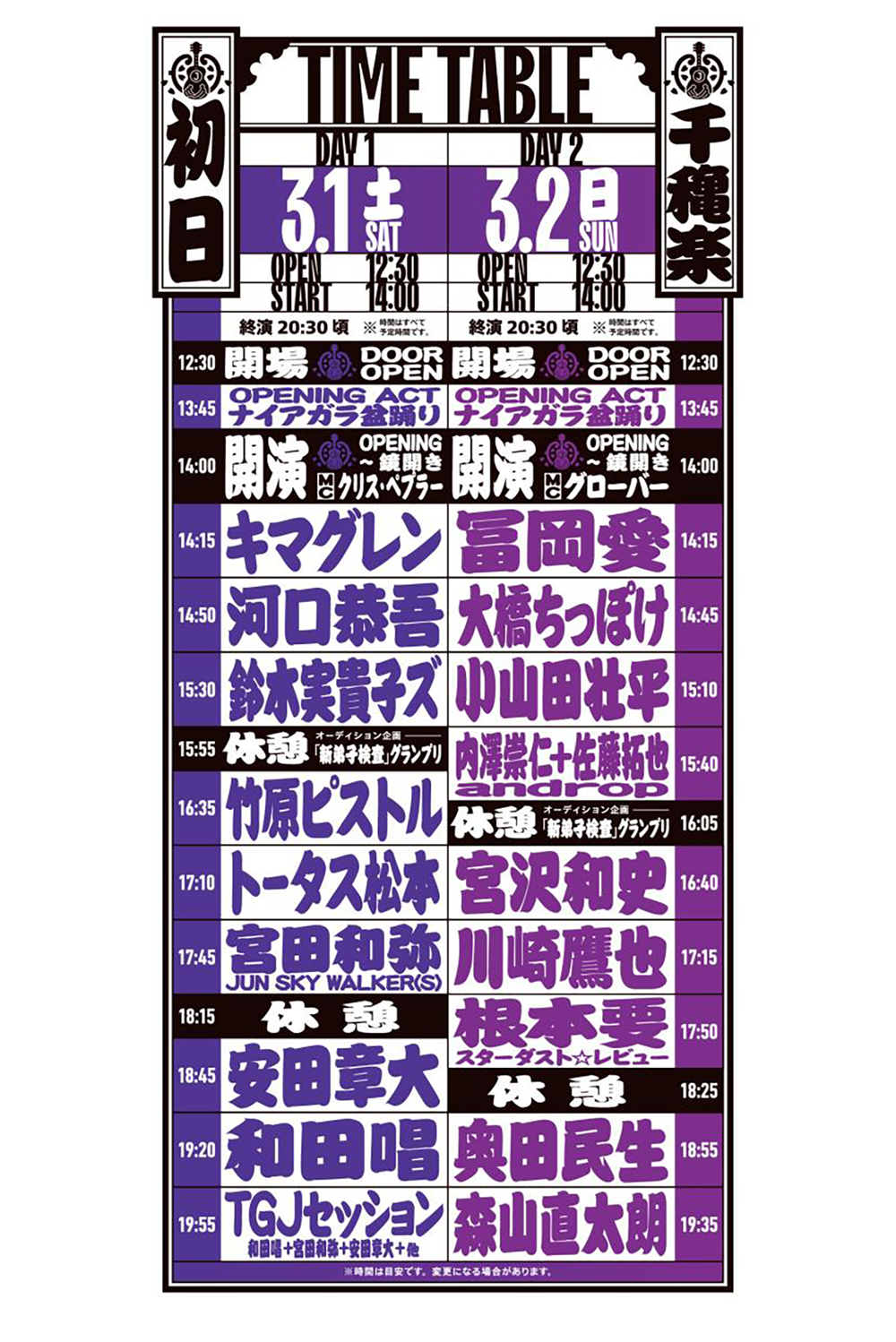 この度、両日のタイムテーブルが発表された。初日のトリ・和田唱のパフォーマンスのあとは「TGJセッション」と銘打って、和田唱、宮田和弥、安田章大らによるスペシャルコラボパフォーマンスも決定。千穐楽の大トリは、おなじみの森山直太朗が締めくくる。