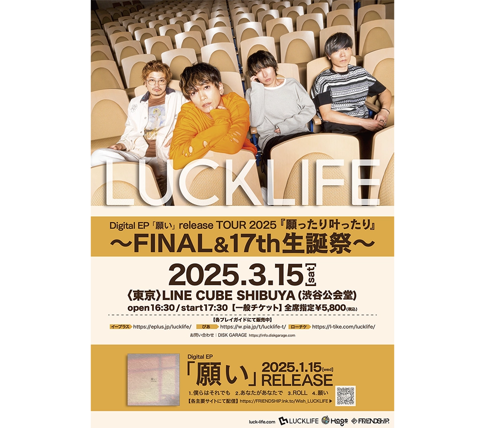 ラックライフはDigital EP『願い』を提げ台湾・韓国の海外を含む全9会場を巡る「願ったり叶ったり」ツアー中。先日国内でのセミファイナルを地元大阪で終え、今週末3月8日(土)には韓国musinsa garageにてツアーセミファイナルを迎える。