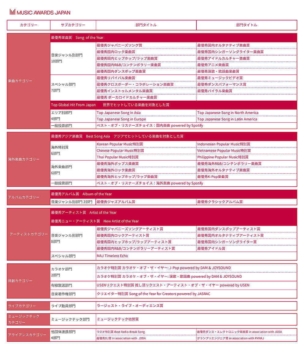 本アワードでは最優秀楽曲賞、最優秀アーティスト賞など主要6部門をはじめ、全62部門を創設。全62部門は、24部門の楽曲カテゴリー、14部門の海外楽曲カテゴリー、3部門のアルバムカテゴリー、11部門のアーティストカテゴリー、4部門の共創カテゴリー、ライブカテゴリー1部門、ミュージックテックカテゴリー1部門、そして4部門のアライアンスカテゴリーと、バラエティーに富んだラインアップ。
