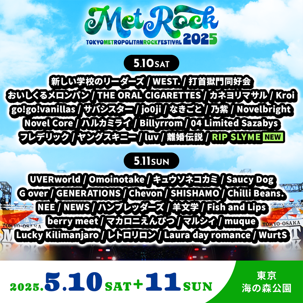 また、先ほど5人での活動再開を発表したRIP SLYMEも10日(土)に出演決定。4ステージ総勢44組の豪華アーティストによる、スケールアップしたMETROCK東京2025にお越しいただきたい。